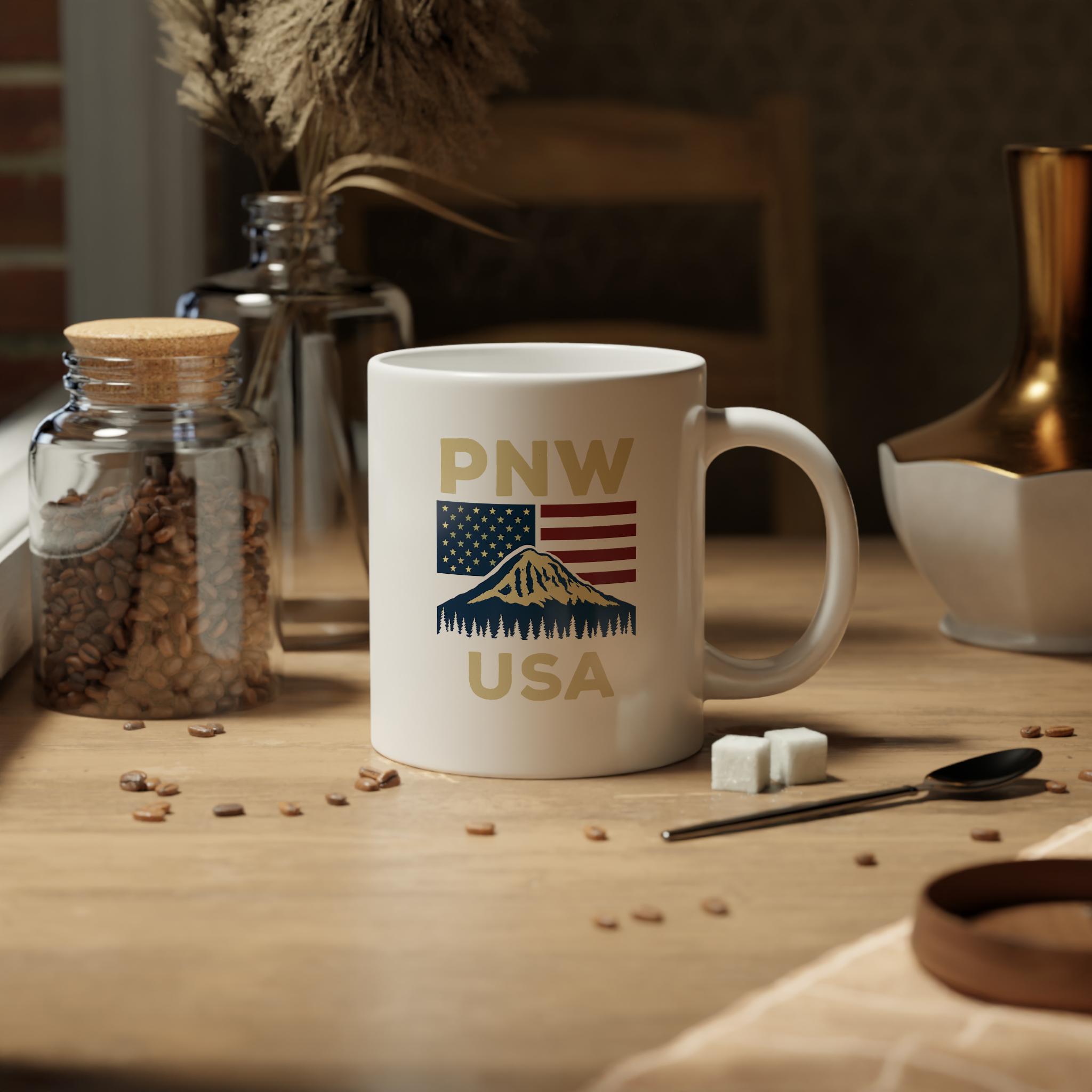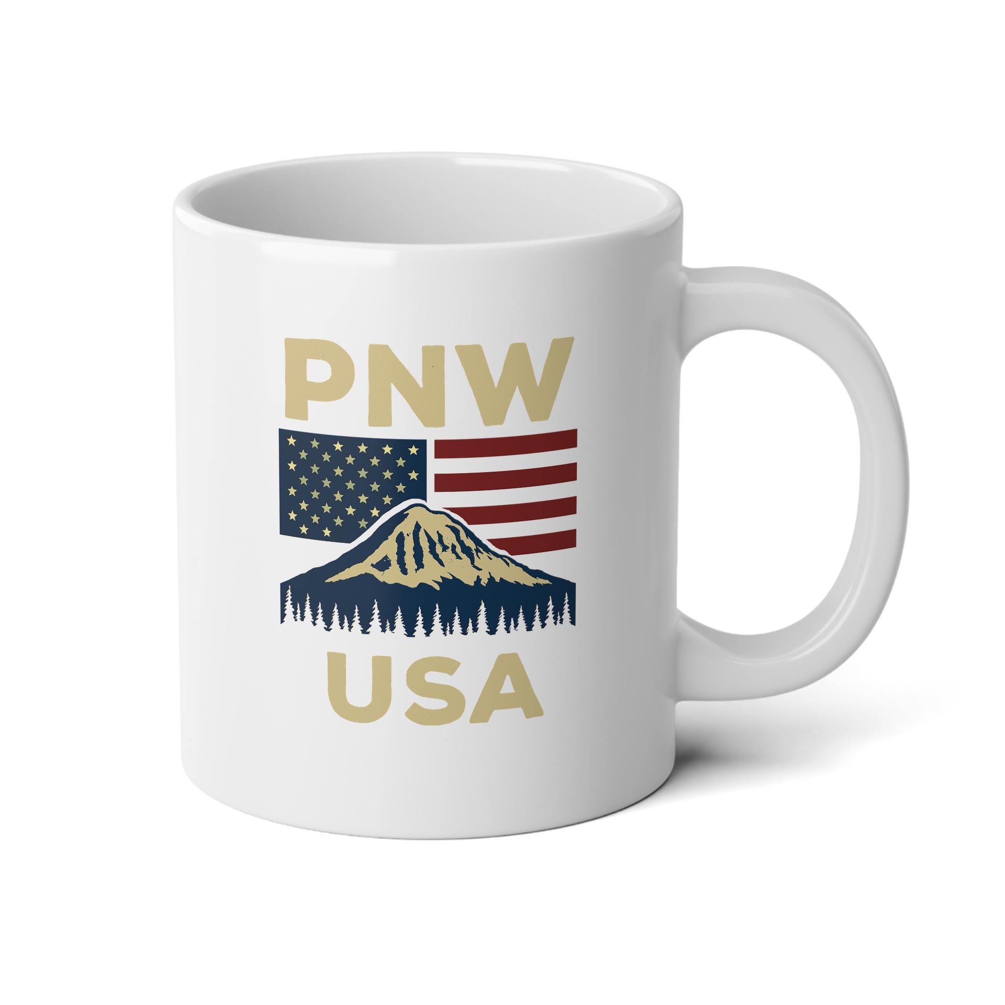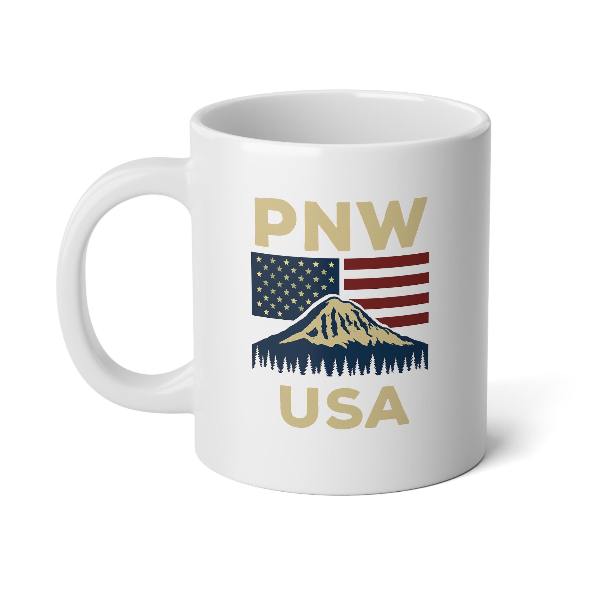 A Pacific Northwest-themed jumbo mug with a touch of patriotism, perfect for enjoying your favorite hot beverages. This mug exudes a cozy and rustic vibe, making it a great addition to your morning routine or as a thoughtful gift for nature lovers and patriots. Ideal for celebrating holidays like Thanksgiving, Fourth of July, and Veterans Day.