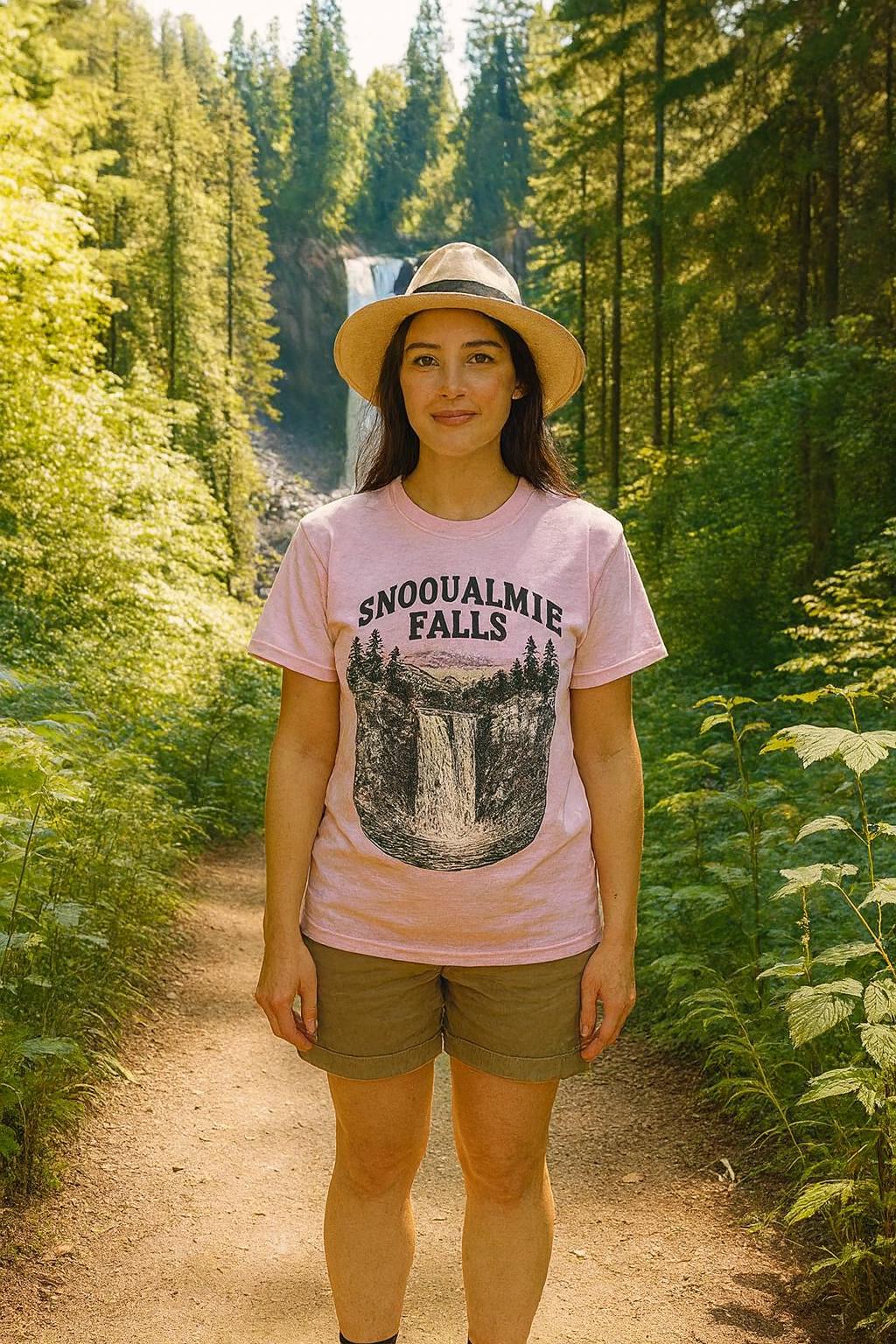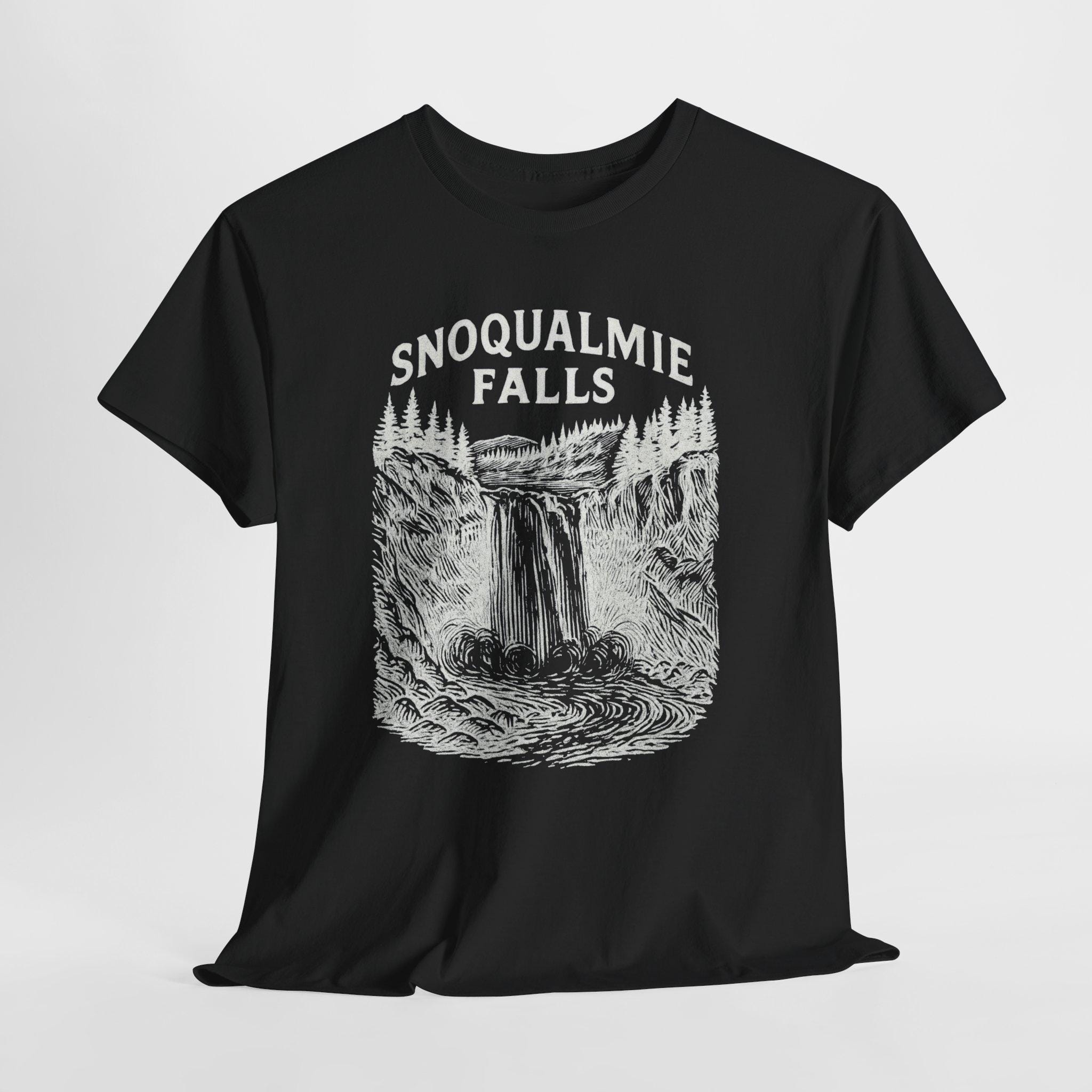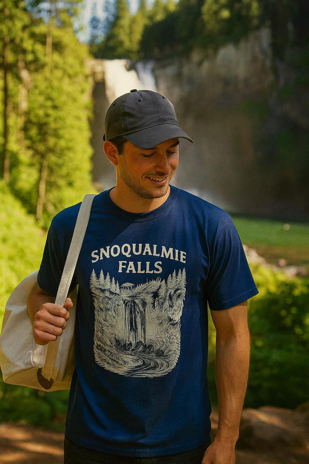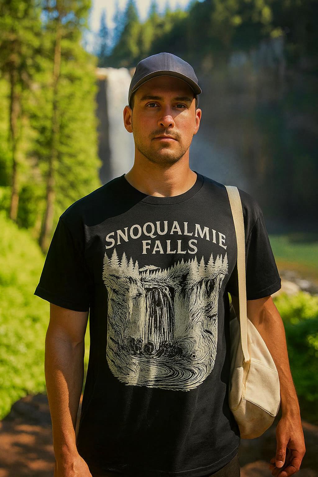 A soft, scenic tee that carries the hush of mist and the rush of falling water. The Snoqualmie Falls illustration sits across the chest like a postcard from the Pacific Northwest — rocky cliffs, frothing whitewater, and evergreen silhouettes drawn with clean, detailed lines. Wear it on slow mornings with a steaming mug or on day hikes to the waterfall trailhead. It layers easily under a flannel or stands alone while you trace the print with your eyes and remember the smell of cedar and river spray. The shirt speaks to people who collect places in memory rather than things: hikers, weekend wanderers, Washington State lovers, and anyone who needs a quiet reminder of wide skies and wet stone.