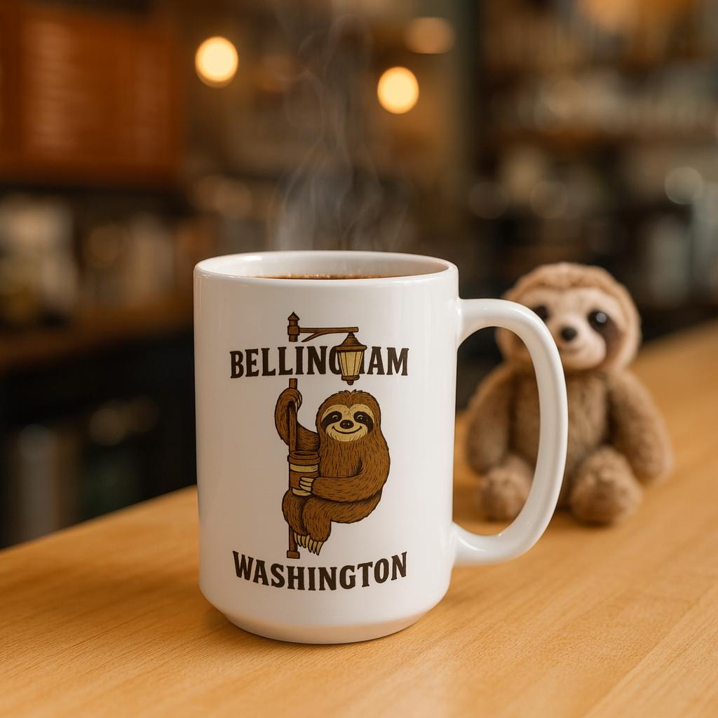 This 15oz ceramic mug carries a little piece of Pacific Northwest whimsy. Inspired by the local legend of roadside stuffed sloth sightings along I‑5 near Lake Samish, its playful design nods to Slothy and the community stories that grew around those quirky mascots. Warm drinks feel a touch more local here — early-morning coffee on a foggy drive, an afternoon tea while swapping sighting rumors with friends, or a quiet moment watching rain patterns on the porch. The mug’s clean white surface and rounded silhouette let the illustration breathe, while the sturdy C-handle keeps it comfortable in hand. It’s for people who like their daily rituals with a wink — lovers of PNW lore, roadside oddities, and small-town charm will recognize the grin behind the design and carry that lighthearted spirit into everyday moments.