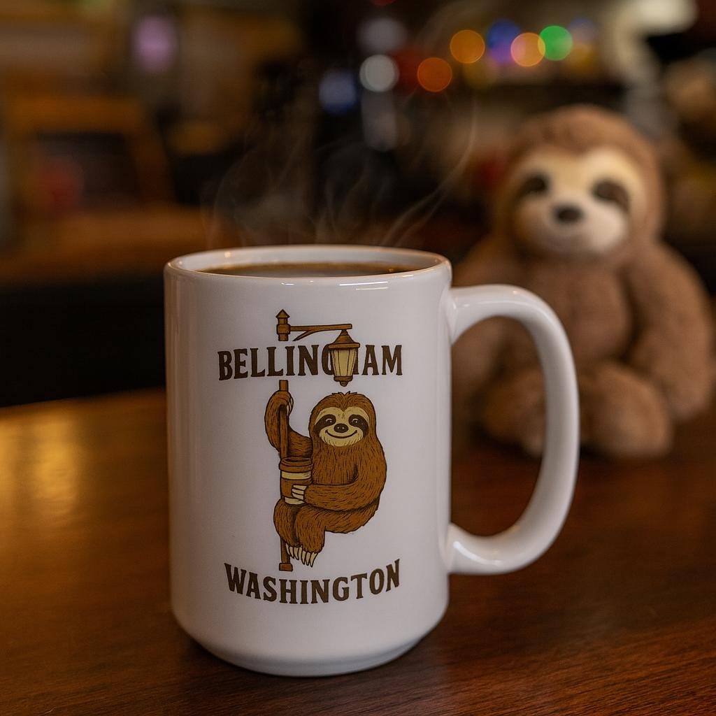 Slothy Roadside Sloth Mug | Pacific Northwest I-5 Lake Samish Nostalgia