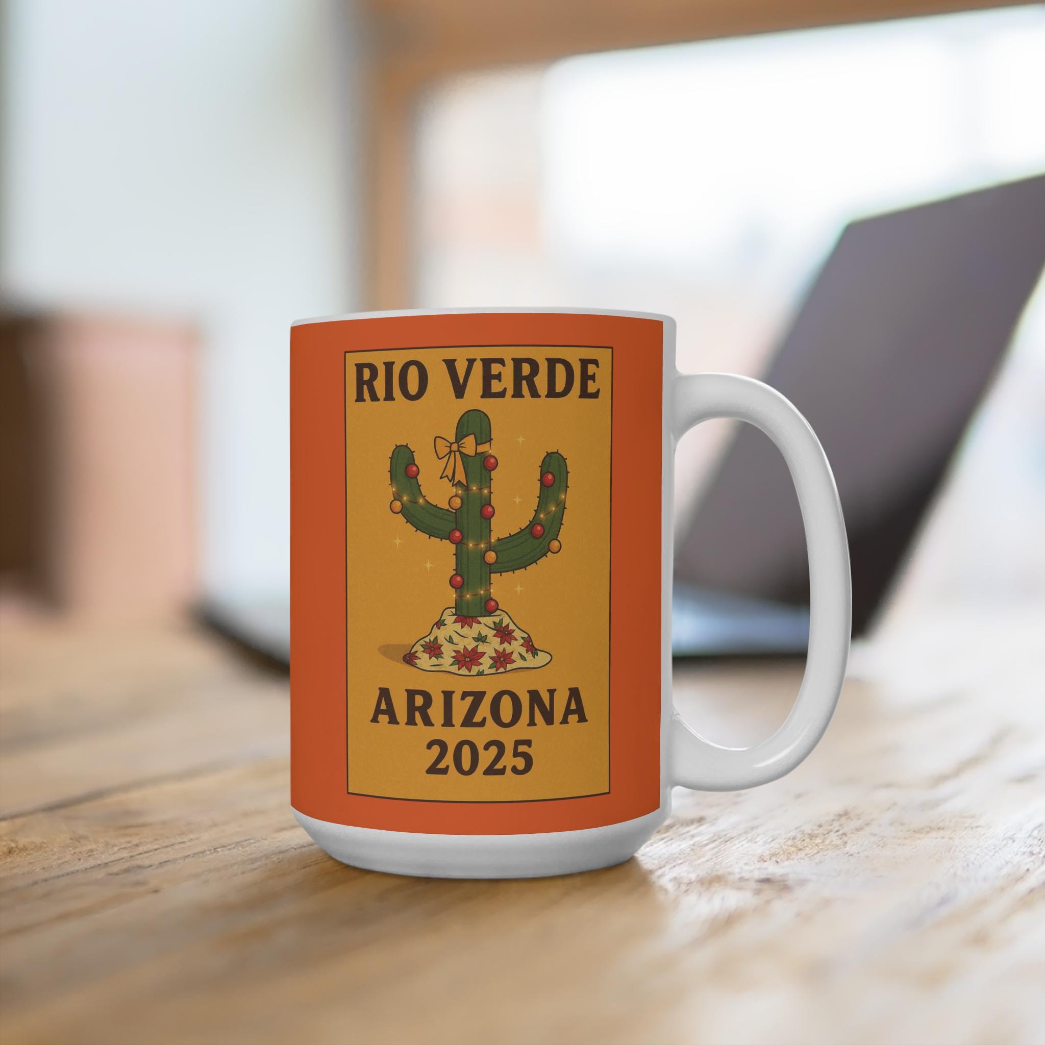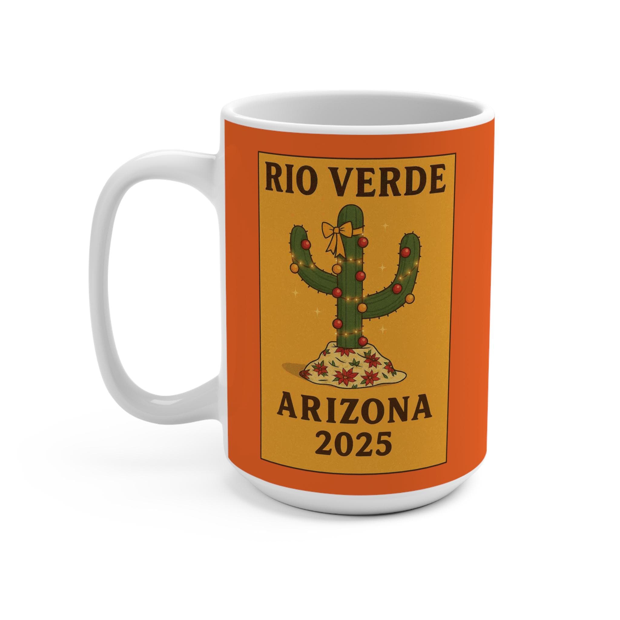 Celebrate the warmth of the desert and the joy of the season with this festive Rio Verde Cactus Poster Mug, a 2025 Arizona souvenir inspired by my mother’s love for holiday cheer and desert charm. Featuring a playful cactus adorned with red ornaments and a golden bow, nestled in snowy stars against a bold orange backdrop, this mug blends Southwestern spirit with cozy winter vibes. Perfect for sipping something warm while reminiscing about sunlit holidays and family traditions. A heartfelt tribute to the woman who taught me that even cacti can sparkle.