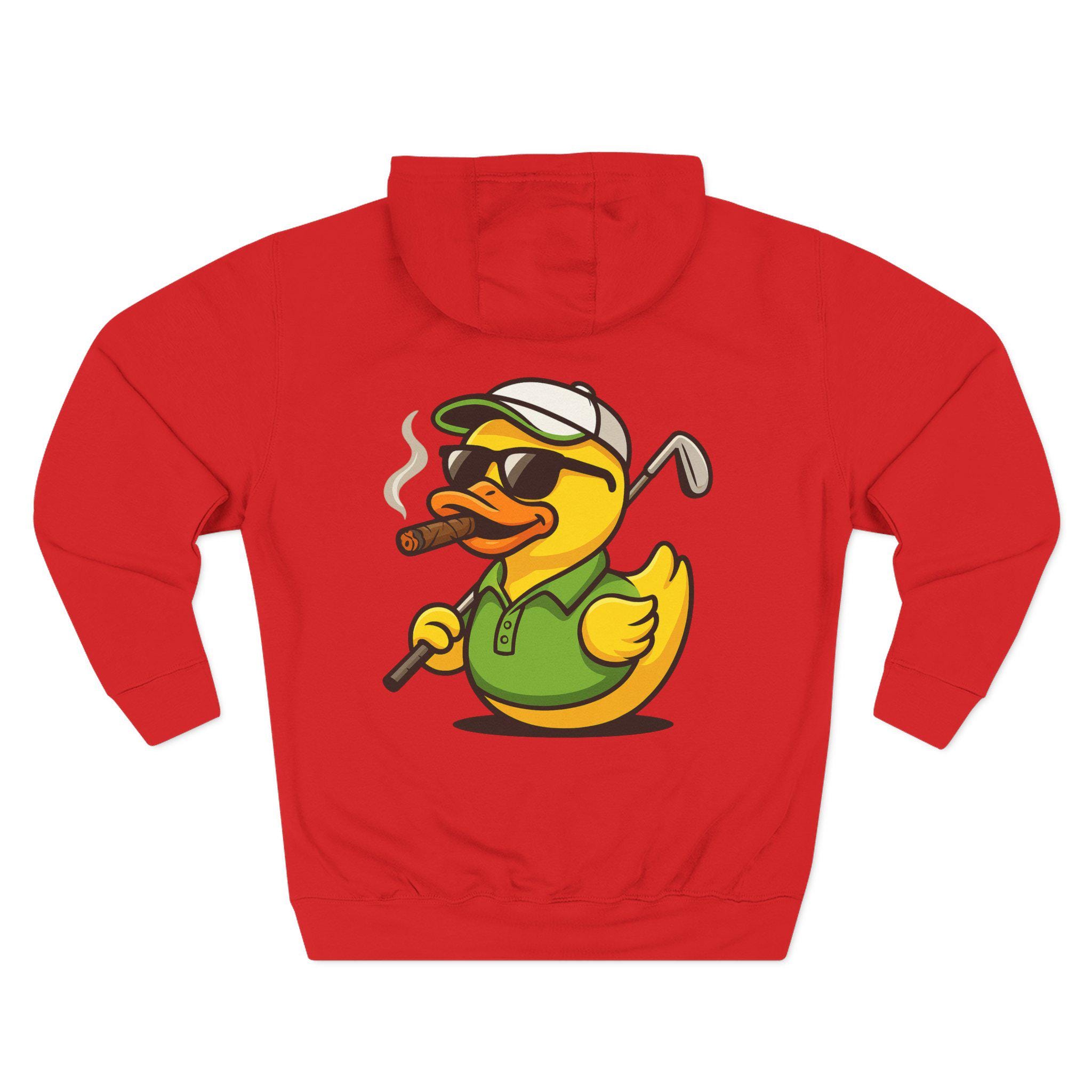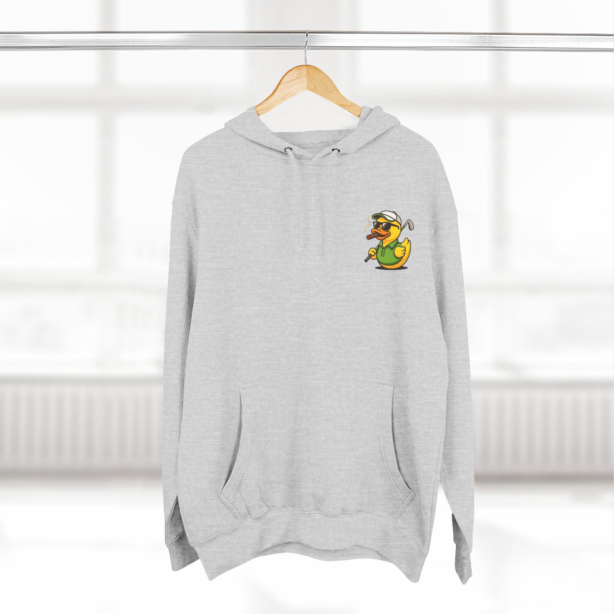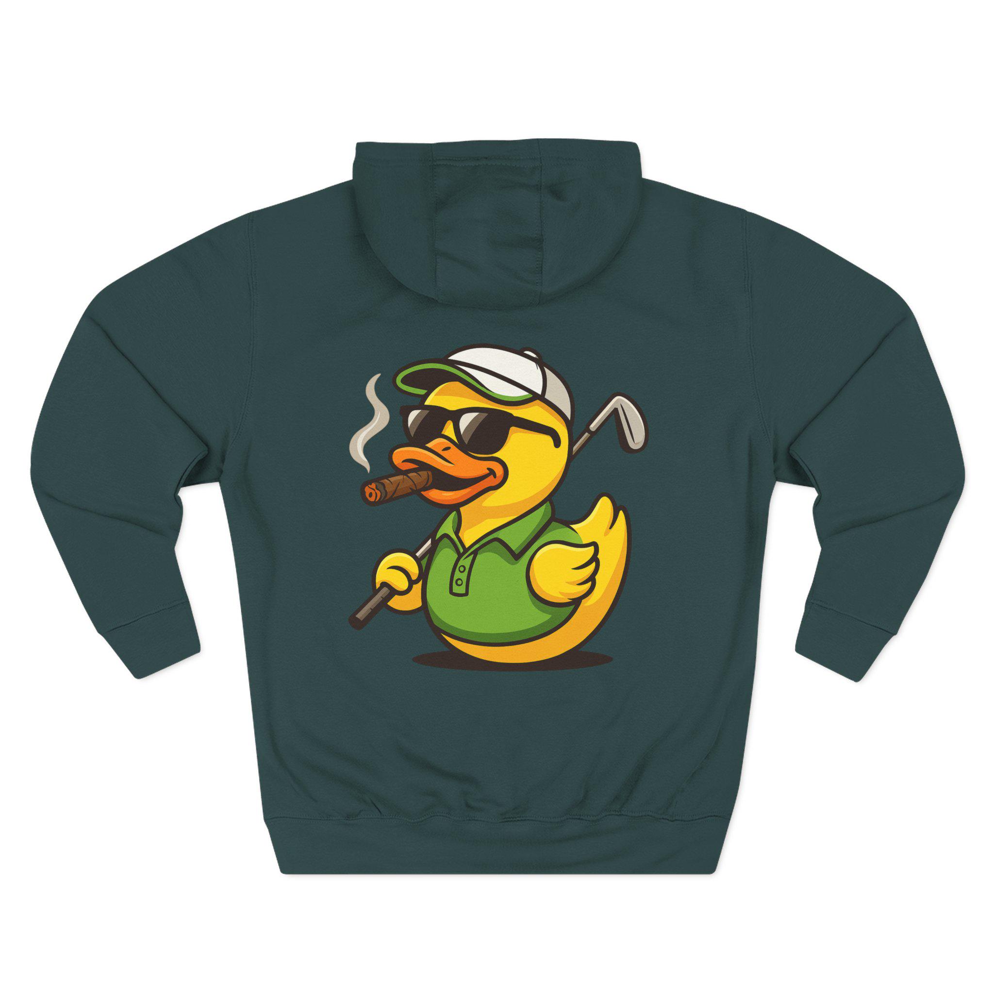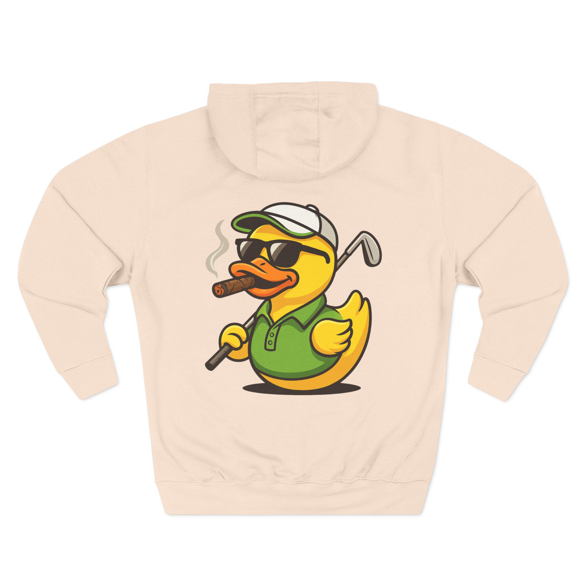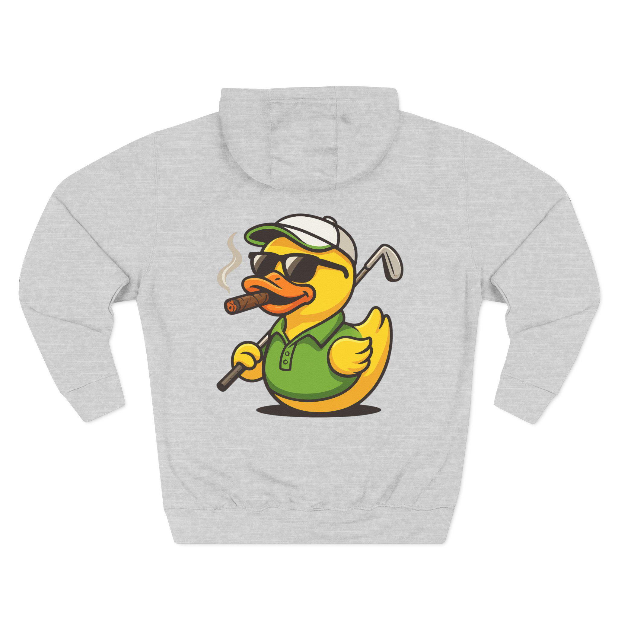 Cigar-Smoking Golfer Duck Hoodie | Golf Cartoon, Three-Panel Fleece