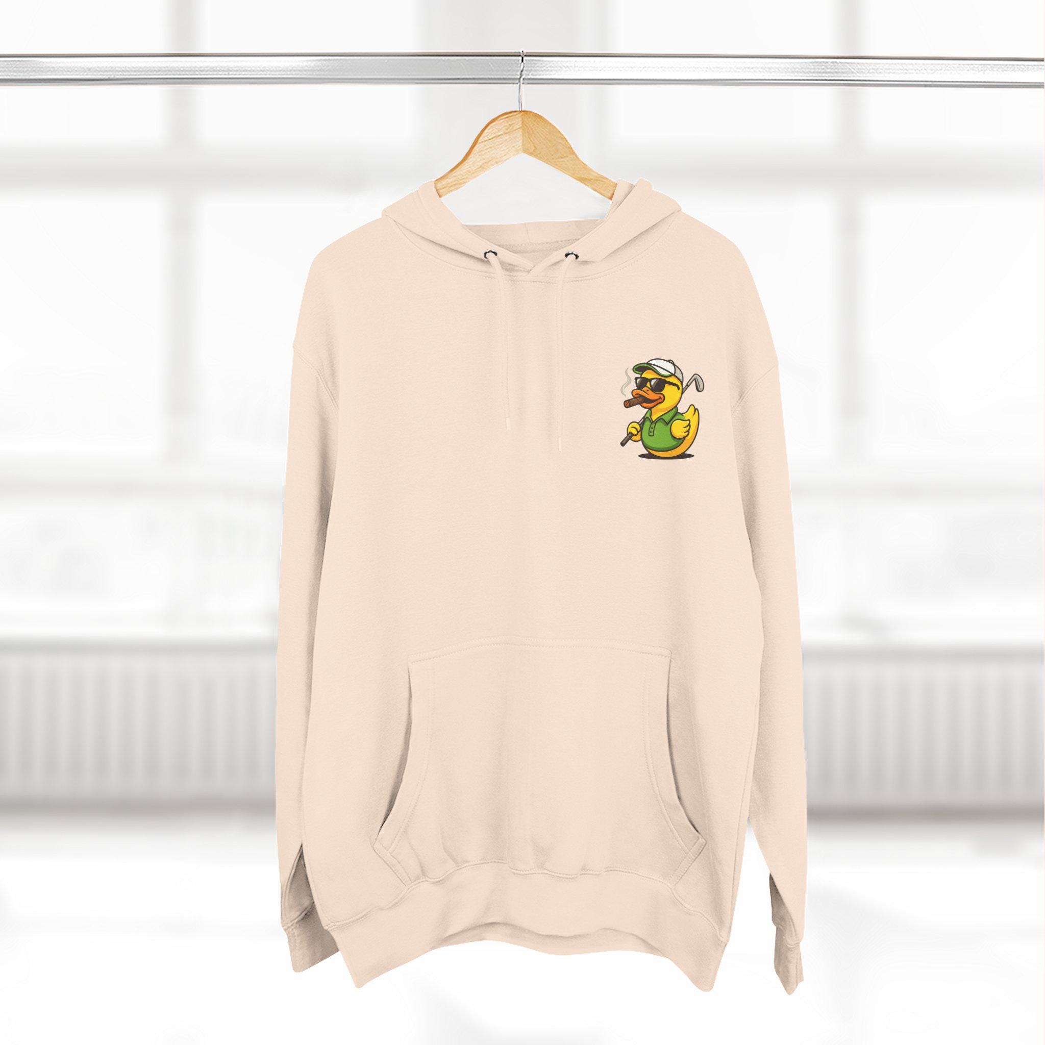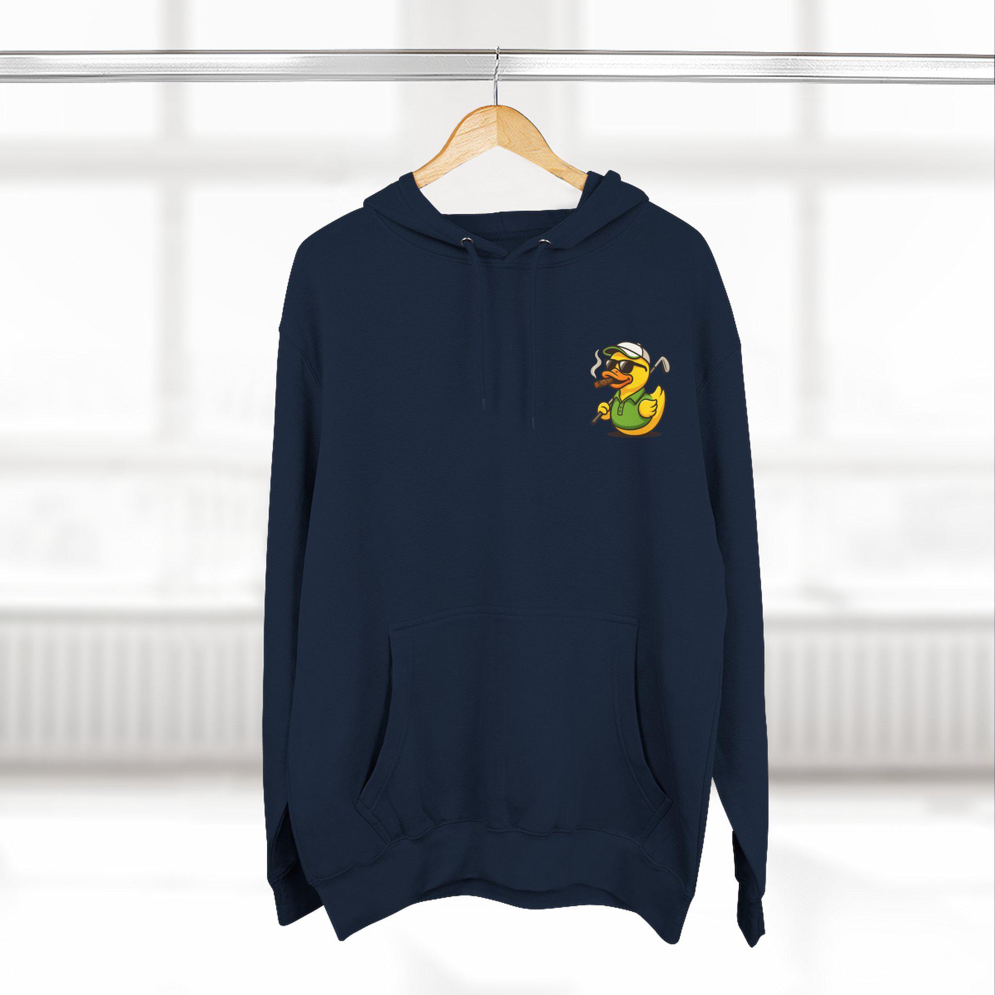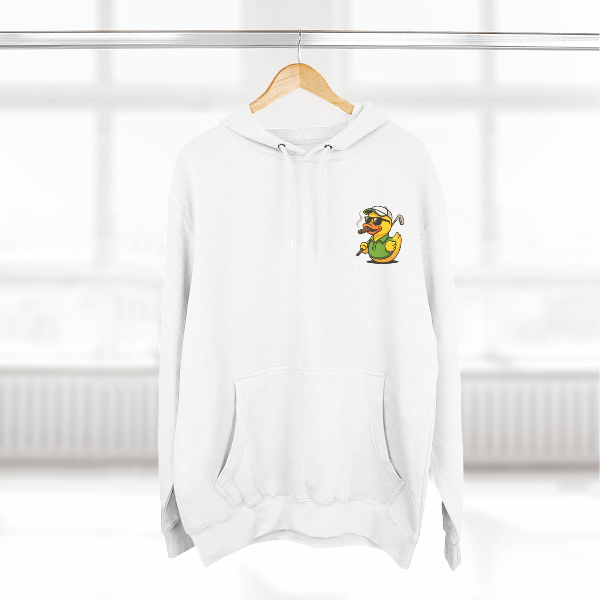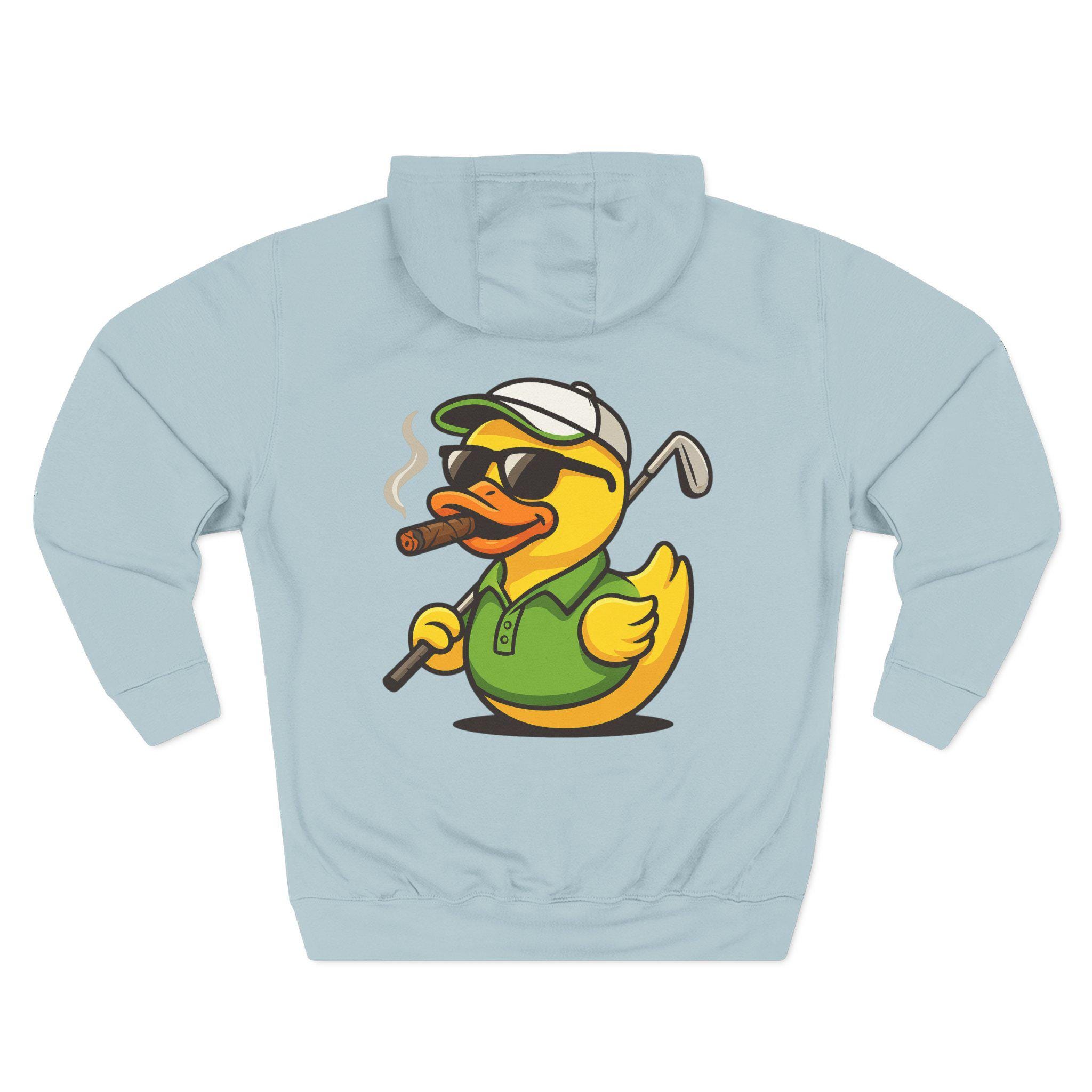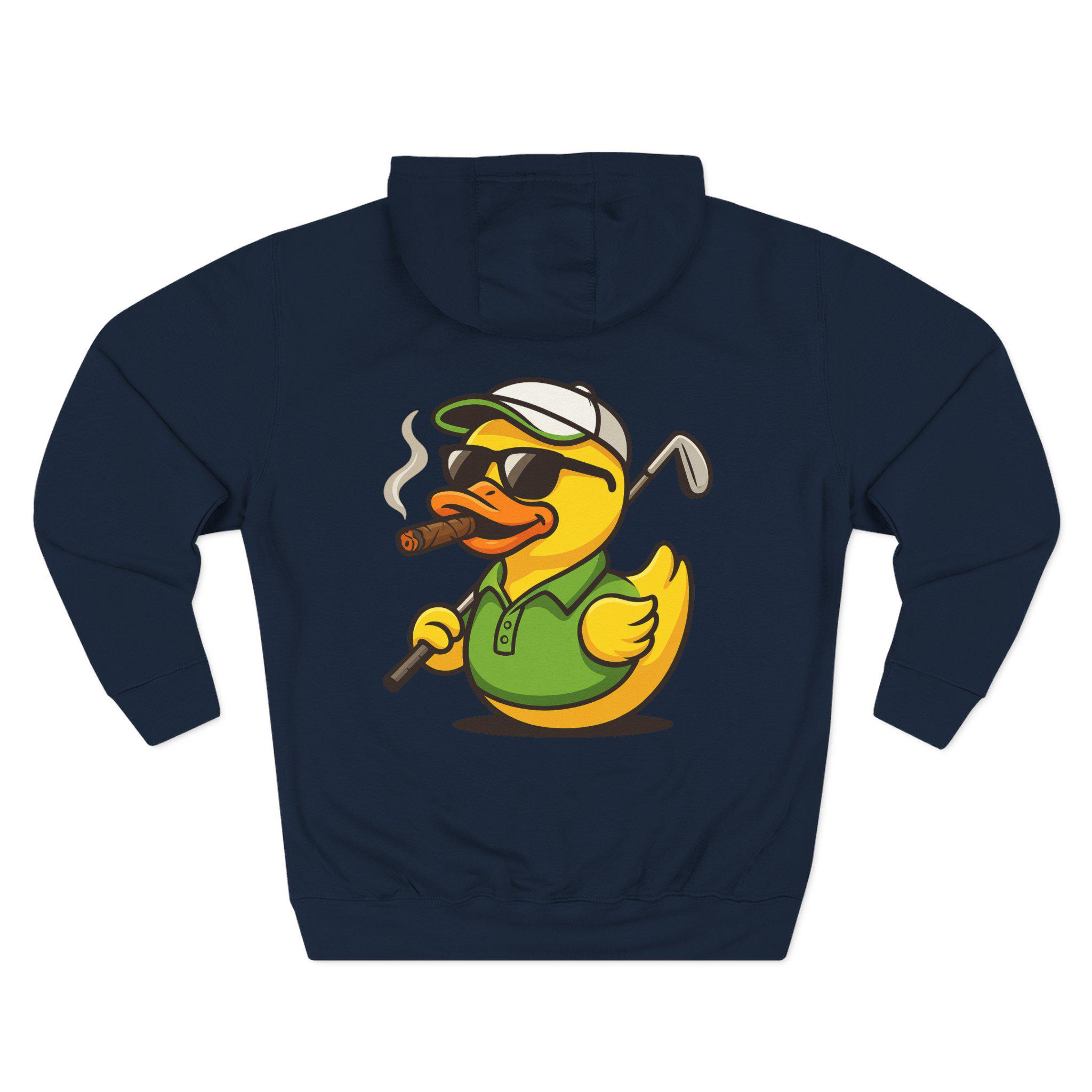 Cigar-Smoking Golfer Duck Hoodie | Golf Cartoon, Three-Panel Fleece