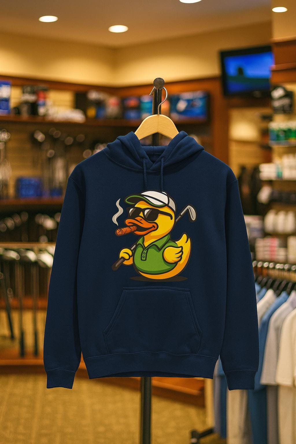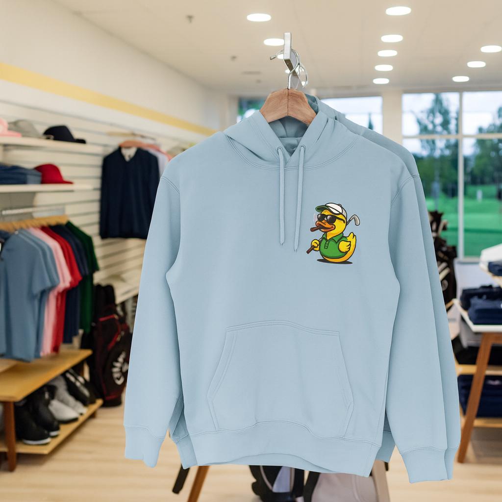 A warm, cheeky hoodie that brings clubhouse attitude to chilly mornings on the range. The illustration of a cigar-smoking duck mid-swing sets a playful, slightly rebellious tone—like the friend who shows up to dawn practice with coffee and a grin. Thick, cozy fleece and a spacious kangaroo pocket make it easy to keep hands warm between shots, while the adjustable hood and durable construction stand up to wind and early-season damp. This hoodie sits comfortably in the rotation for golfers who appreciate humor and function together: wear it to brisk range sessions, casual post-round hangouts, or slow, smoky evenings by the clubhouse firepit.