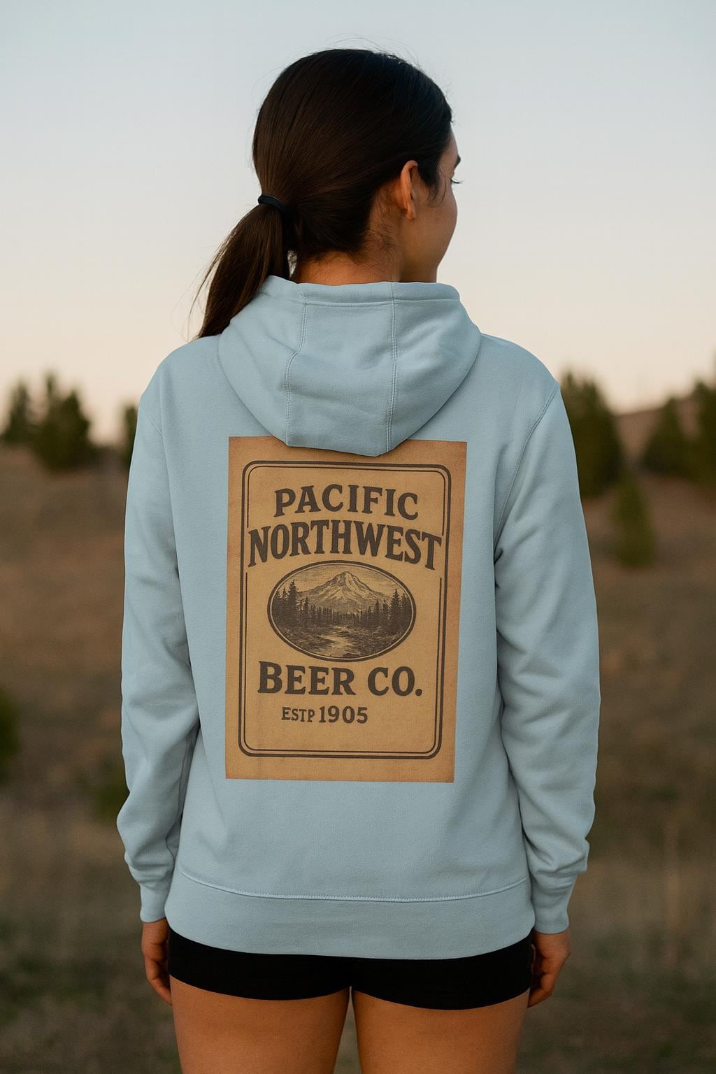 This midweight fleece hoodie feels like a campfire evening turned into clothing. It settles in like a familiar jacket—soft against skin, warm without weight, and built to last through hikes, brewery runs, and laid-back nights at the cabin. The roomy kangaroo pocket keeps hands warm or holds a phone and keys. A structured hood with woven drawcords and metal grommets frames your head when wind picks up. The front is clean and smooth for printing while the back shows a vintage Pacific Northwest beer label look that reads like a well-traveled poster—earthy, nostalgic, and quietly rugged. Subtle details—twill neck tape, double-needle topstitching, and a tear-away label—make it comfortable and durable. It wears true to size and keeps its shape after washes, so it becomes one of those go-to pieces you reach for again and again.