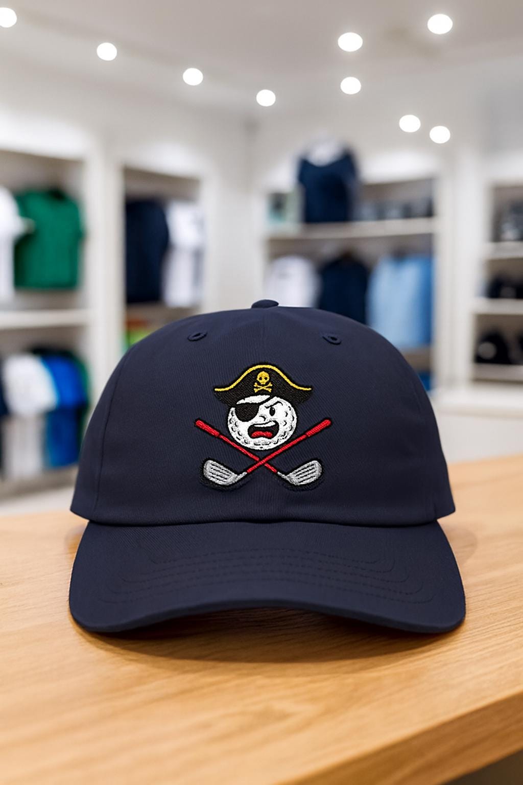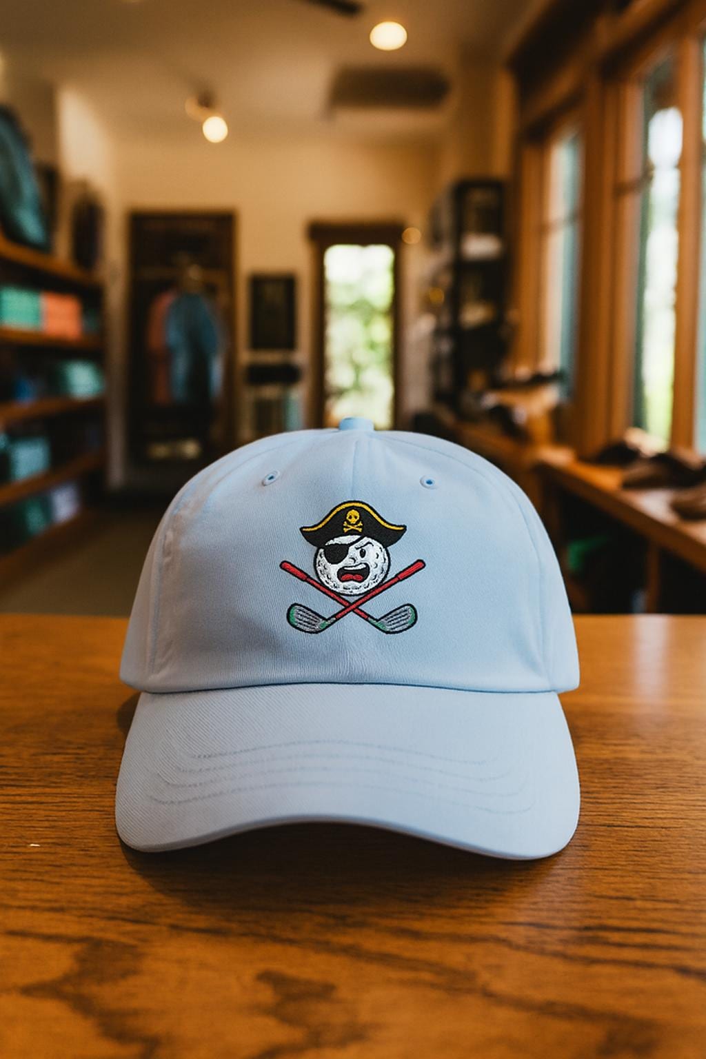 A relaxed, weathered-feel dad cap stamped with a playful pirate golf ball logo — equal parts cheeky and outdoorsy. It sits low and easy on the head, shielding your eyes with a precurved visor whose underside matches the top for a tidy, finished look. Wear it on the back nine to show a little clubhouse swagger, or toss it on for errands and dog walks when you want a touch of mischief. The adjustable hideaway strap with antique-brass hardware keeps the fit personal and comfortable. Lightweight cotton lets the cap breathe through long rounds under the sun, and small details like the sewn-in label and brand sticker on the visor give it that authentic, lived-in character.
