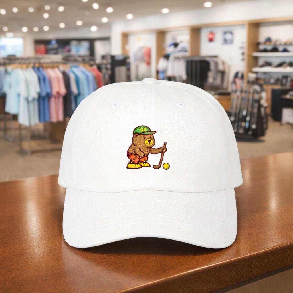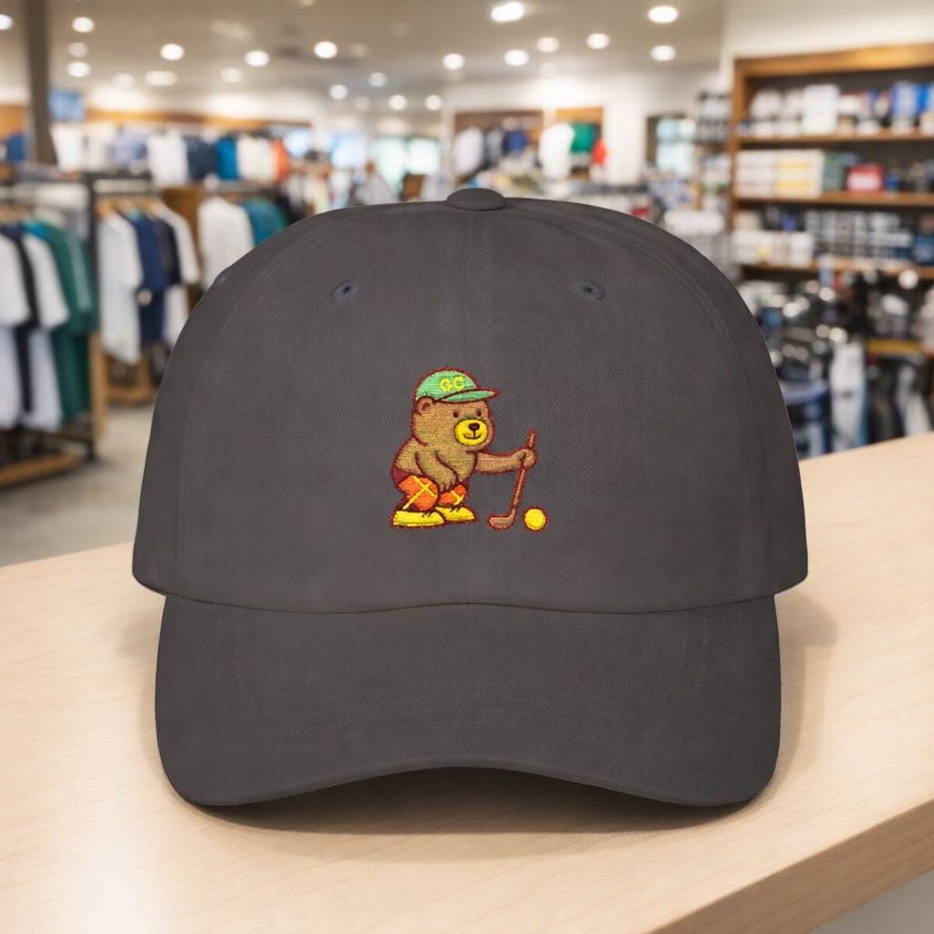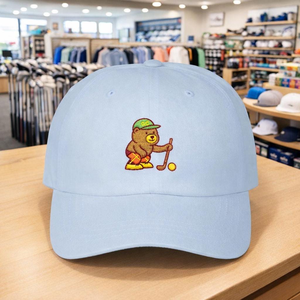A soft, worn-in dad cap embroidered with a tiny golfer bear lining up a putt. It sits low and relaxed on your head, the curved Permacurv® visor shading your eyes as you watch the green or stroll the neighborhood. The little bear adds a quiet, goofy charm — the kind of detail that starts conversations on the course and sparks a smile at the clubhouse. Lightweight cotton keeps things breathable through warm afternoons, and the hideaway strap with antique brass buckle lets you dial in a snug, personal fit. Bring it to weekend rounds, morning walks, or lazy afternoons at the driving range; it feels like a familiar companion from the first wear.