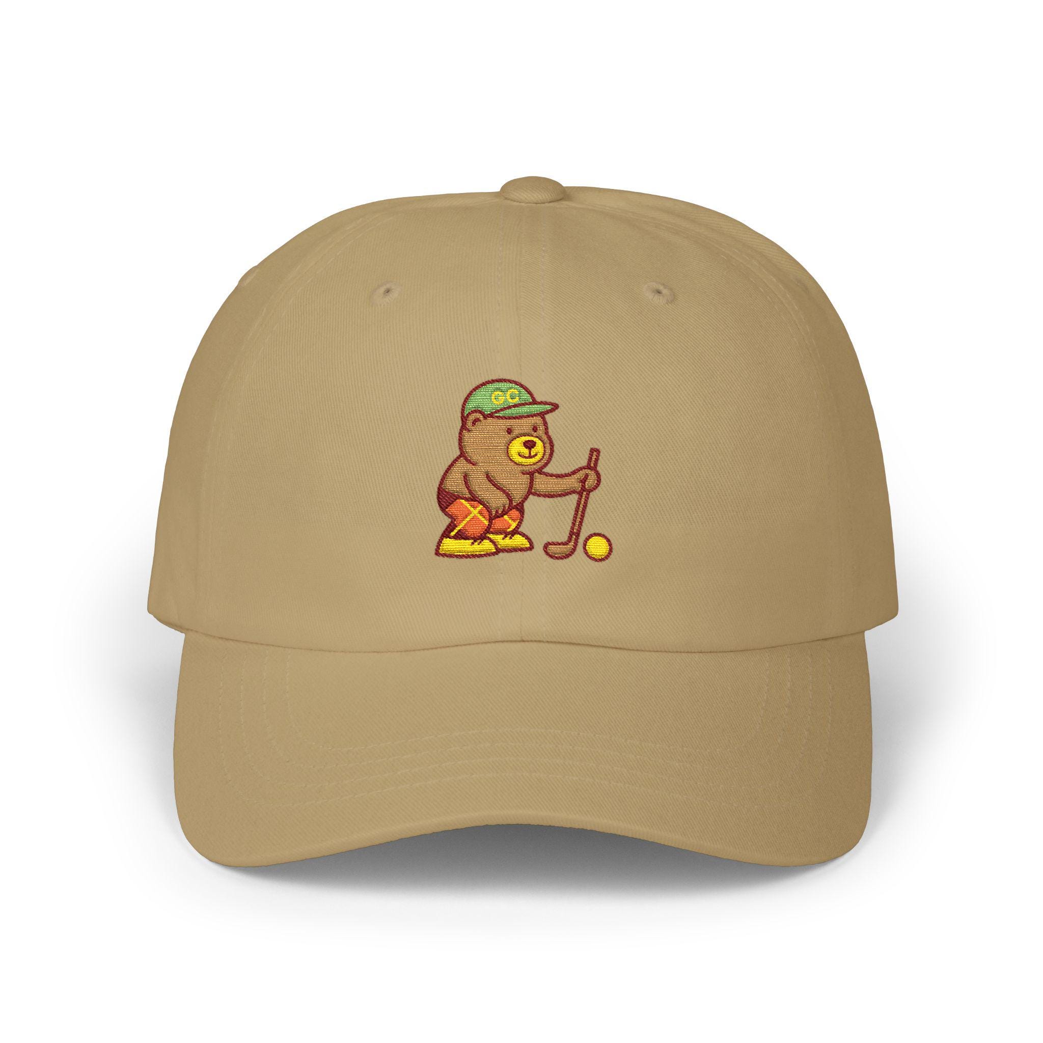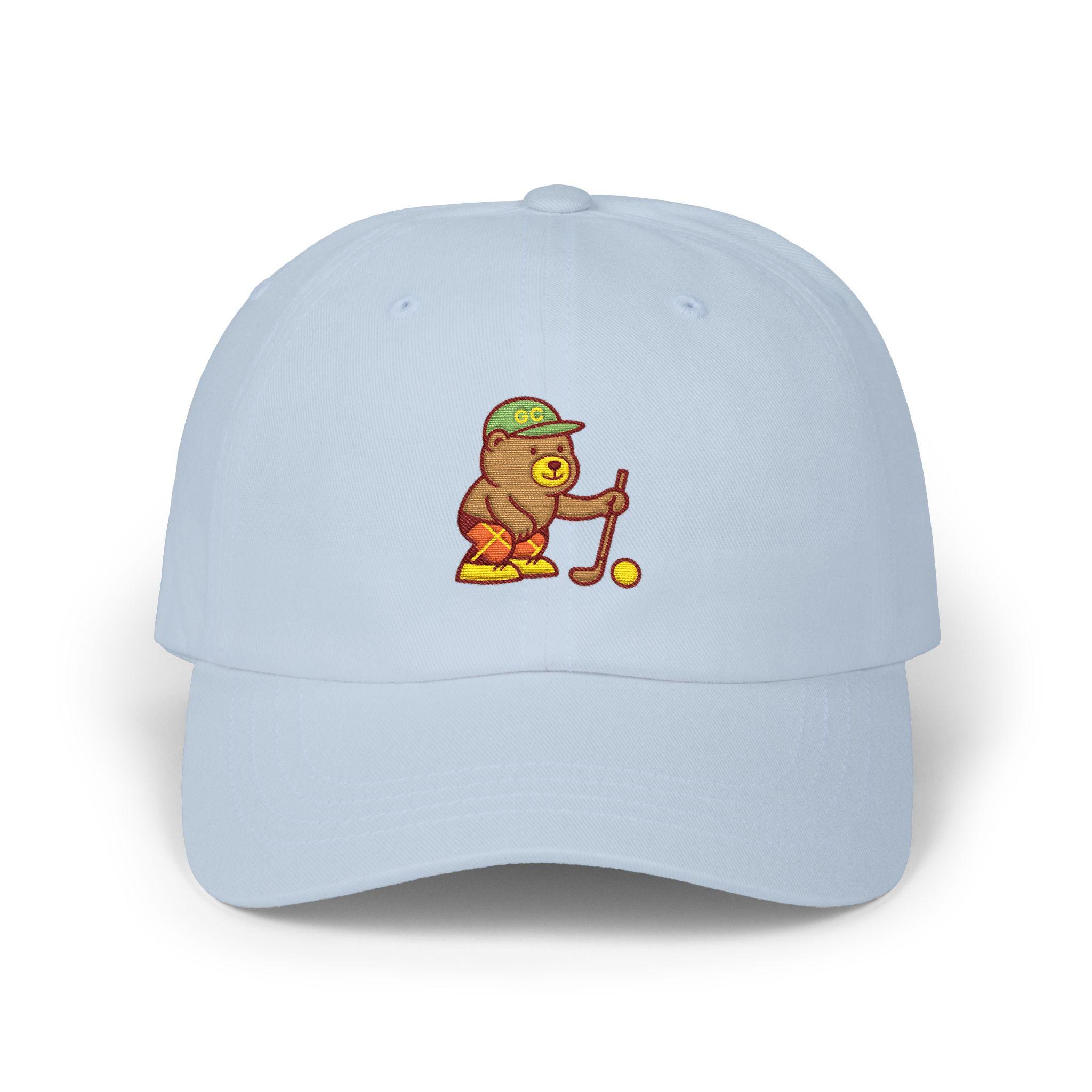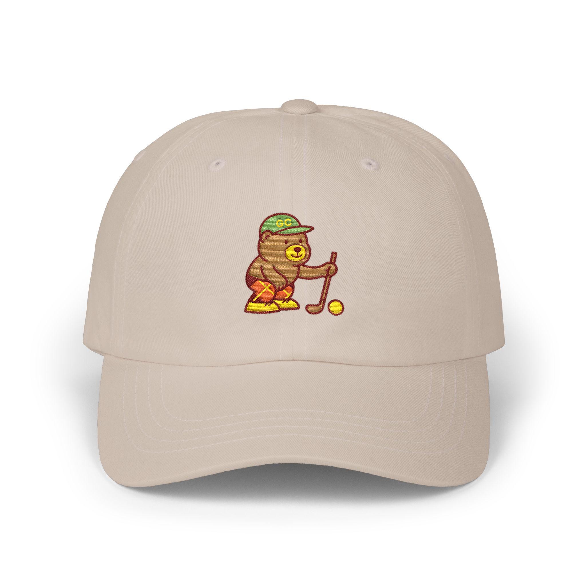 A soft, worn-in dad cap embroidered with a tiny golfer bear lining up a putt. It sits low and relaxed on your head, the curved Permacurv® visor shading your eyes as you watch the green or stroll the neighborhood. The little bear adds a quiet, goofy charm — the kind of detail that starts conversations on the course and sparks a smile at the clubhouse. Lightweight cotton keeps things breathable through warm afternoons, and the hideaway strap with antique brass buckle lets you dial in a snug, personal fit. Bring it to weekend rounds, morning walks, or lazy afternoons at the driving range; it feels like a familiar companion from the first wear.