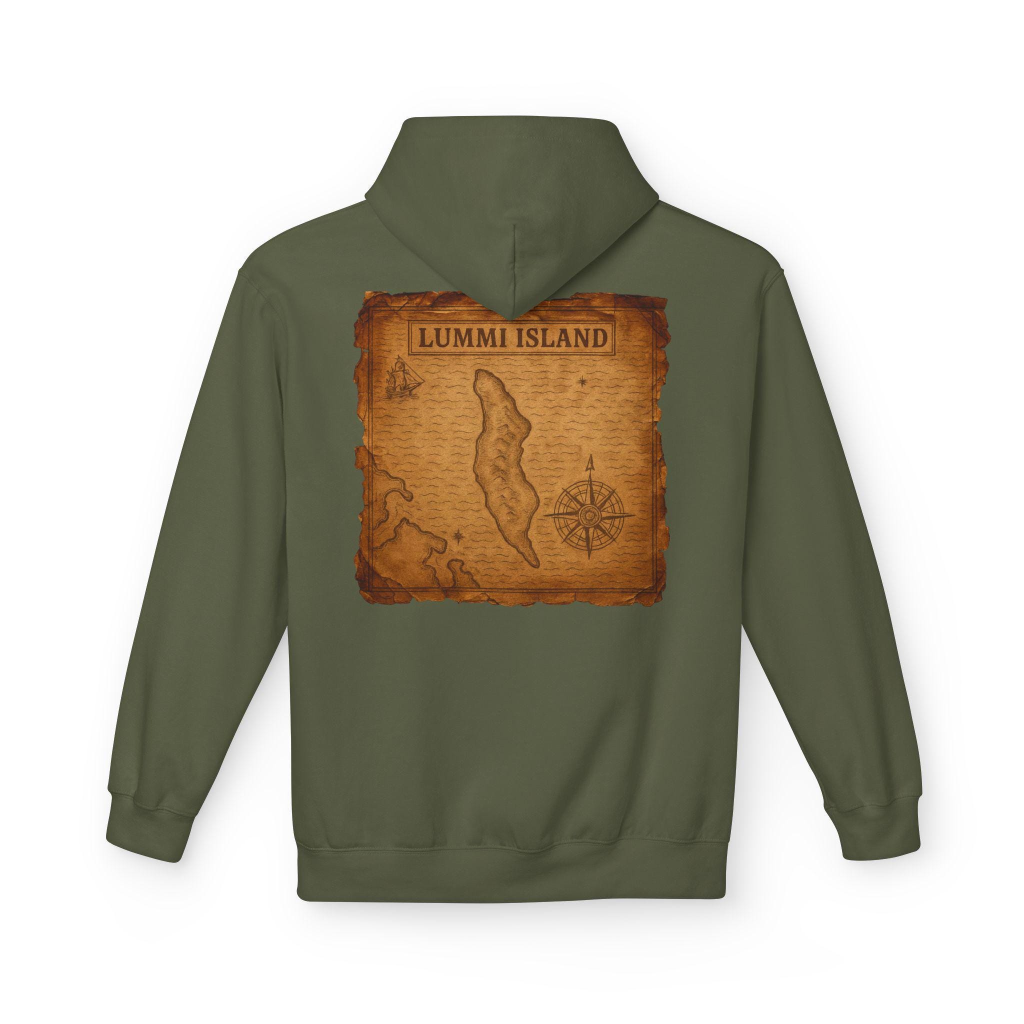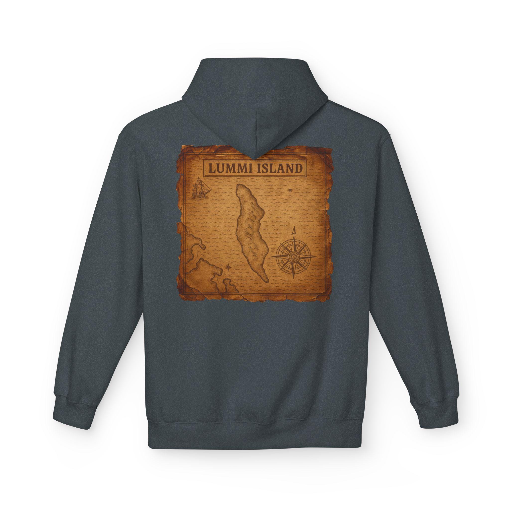 Wear a piece of coastal history. This midweight hoodie carries a vintage nautical map of Lummi Island—faded ink lines, old-school charting, and a sense of salt air and cedar smoke. It settles in like a familiar cardigan for folks who know the Salish Sea by name: boat handlers checking tides, island weekenders, and anyone who remembers long mornings on a ferry. The relaxed drop-shoulder silhouette and warm lined hood make it easy to throw on after a damp morning row or while sitting on a porch swapping sea stories. Subtle, worn-map artwork keeps the look weathered and lived-in—the kind of piece that ages with you and the places you return to.