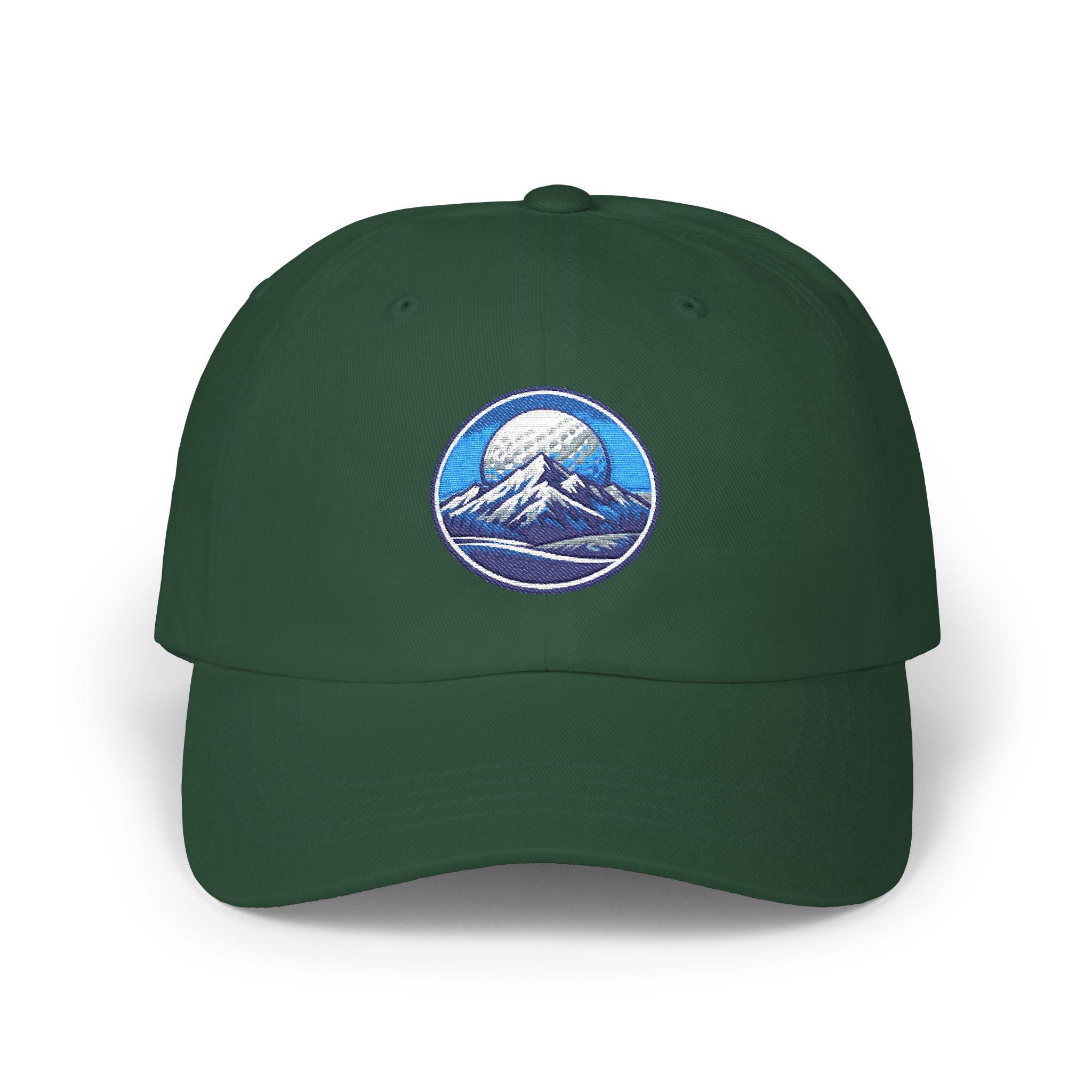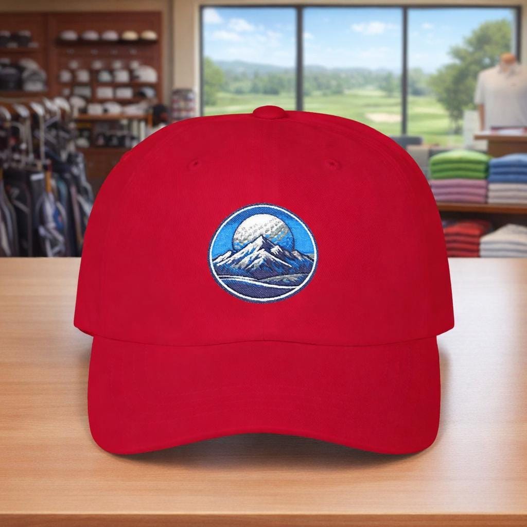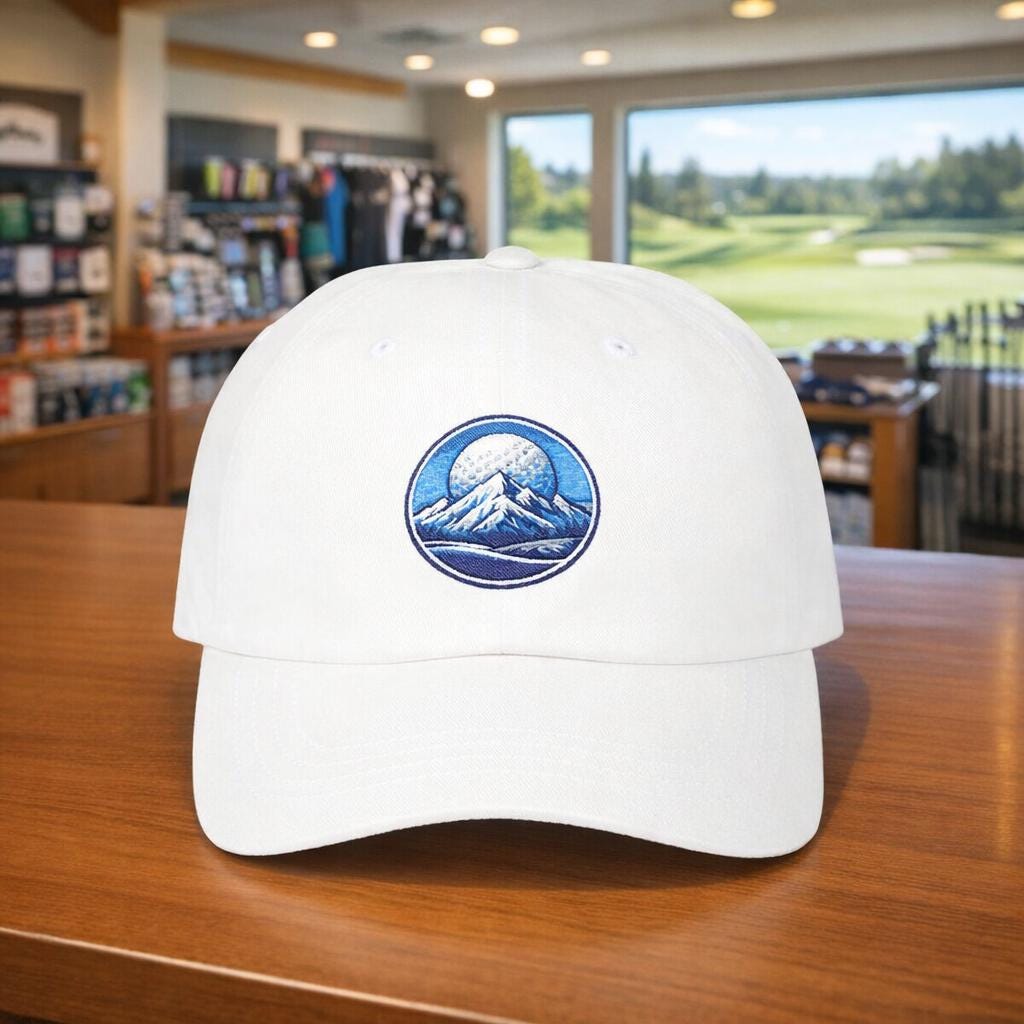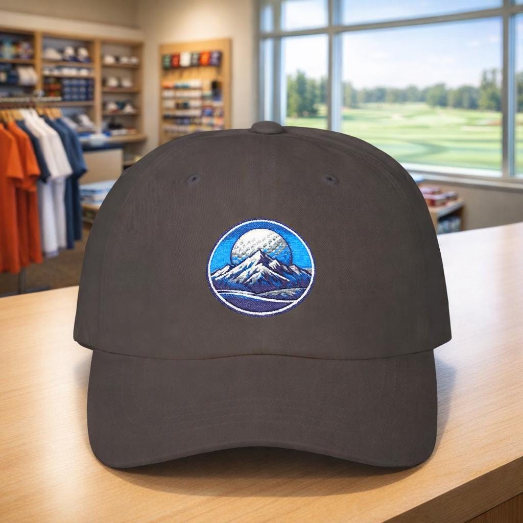 A worn-in cap for early tee times and frosty fairways. The design shows a golf ball cresting above a snow-capped peak — a quiet salute to golfers who chase rounds through misty pines and icy greens in the Pacific Northwest. Lightweight and low-profile, it settles easily over a beanie or bare head and keeps sun and sleet out of your eyes with a precurved visor whose underside matches the top for a clean, cohesive look. The adjustable hideaway strap with antique-brass hardware lets you dial in a secure fit after a long walk to the first tee. Bring this cap along to dawn starts, après-round coffee stops, or when you just want something that reads outdoorsy and lived-in.