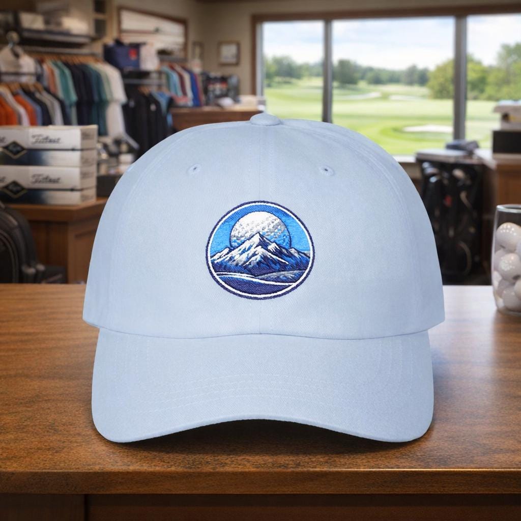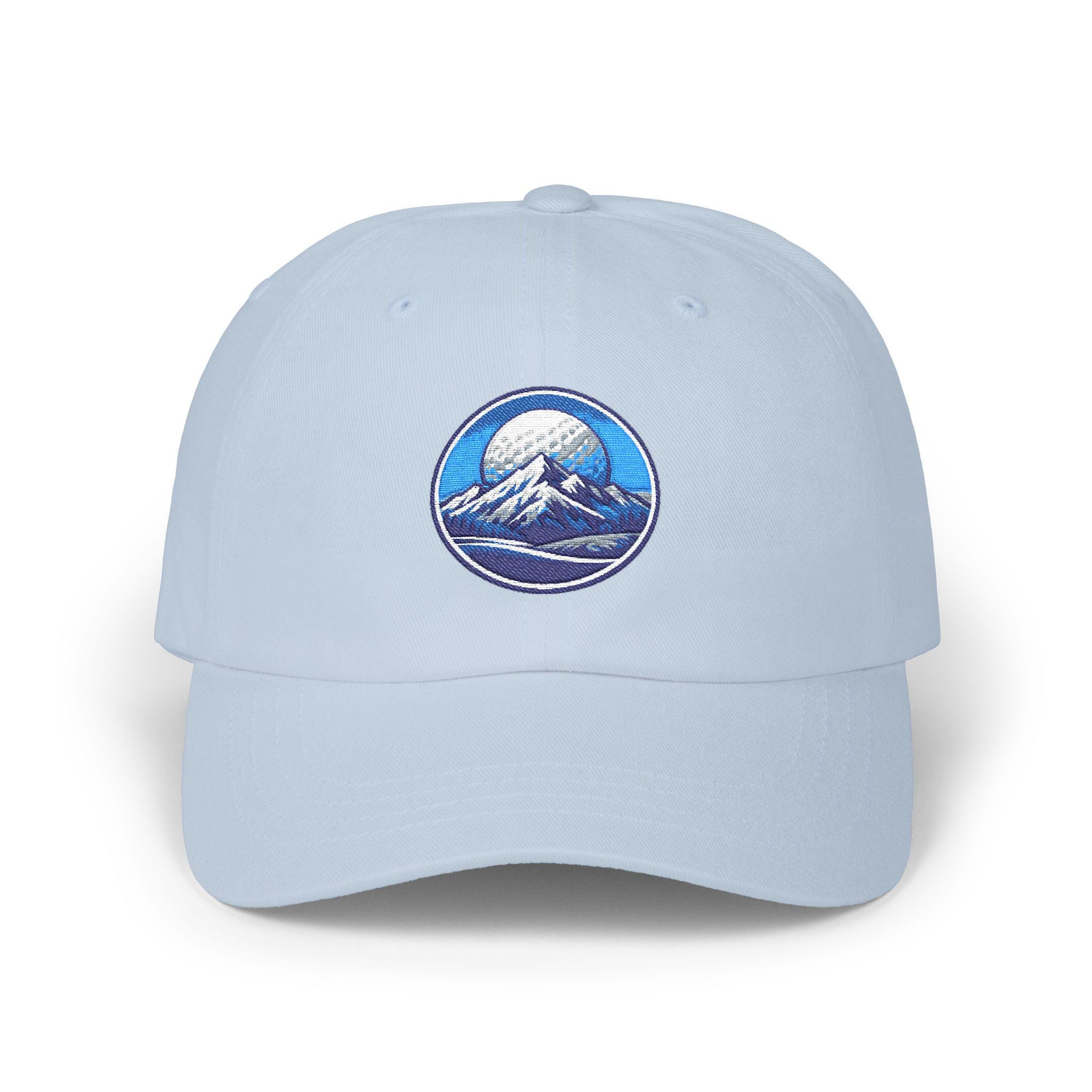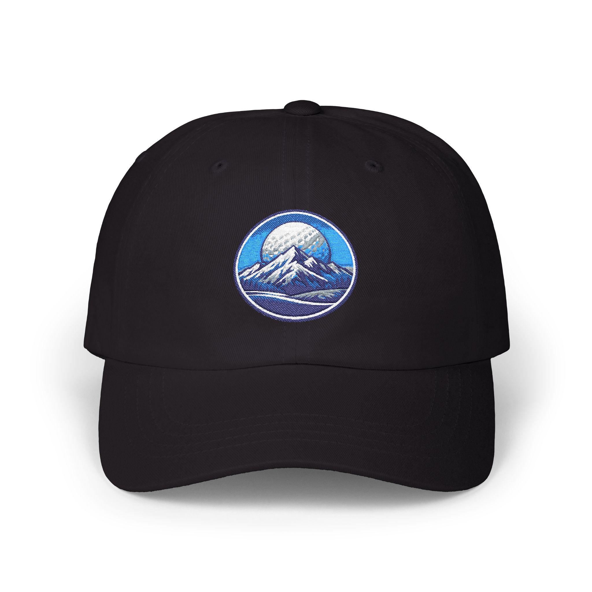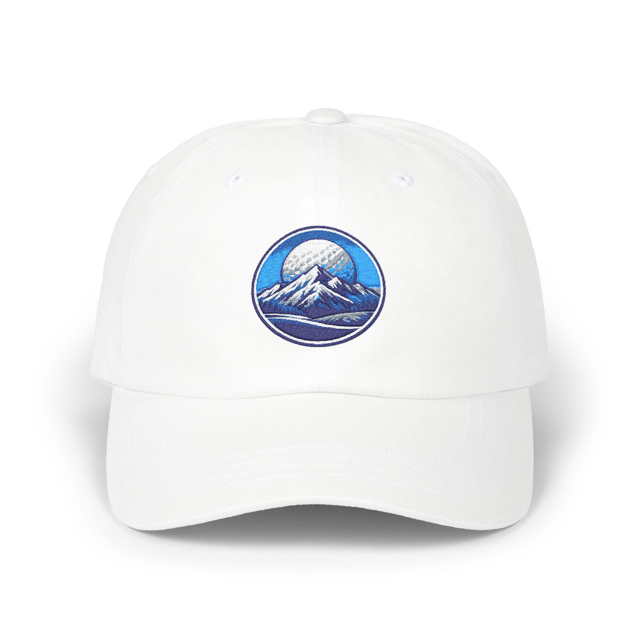 A worn-in cap for early tee times and frosty fairways. The design shows a golf ball cresting above a snow-capped peak — a quiet salute to golfers who chase rounds through misty pines and icy greens in the Pacific Northwest. Lightweight and low-profile, it settles easily over a beanie or bare head and keeps sun and sleet out of your eyes with a precurved visor whose underside matches the top for a clean, cohesive look. The adjustable hideaway strap with antique-brass hardware lets you dial in a secure fit after a long walk to the first tee. Bring this cap along to dawn starts, après-round coffee stops, or when you just want something that reads outdoorsy and lived-in.