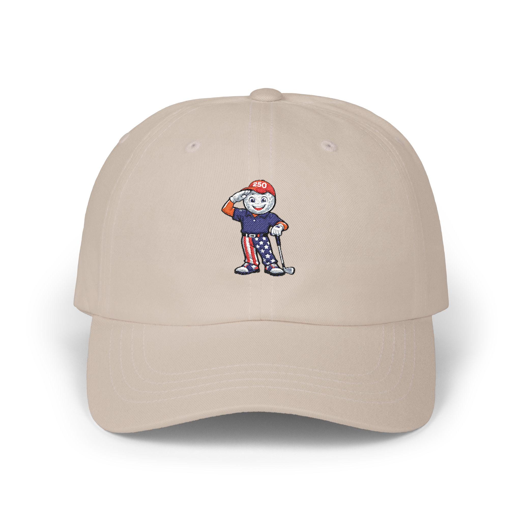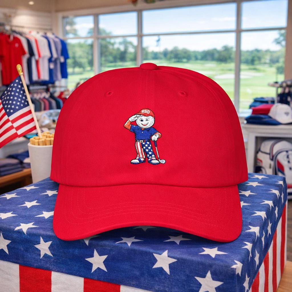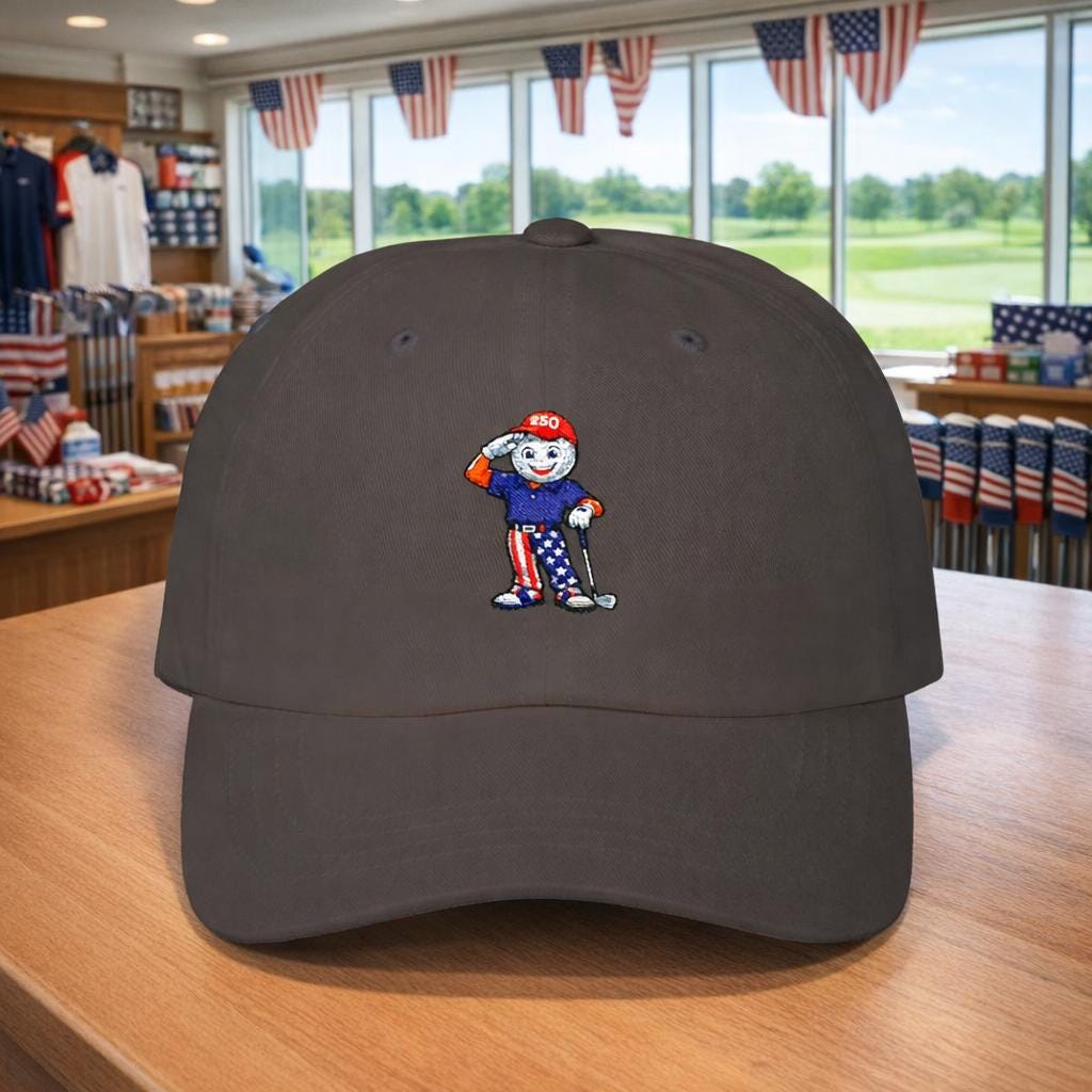 This limited-edition golf hat features a bold embroidered mascot: a golf ball-faced golfer decked out in red, white, and blue, saluting the fairway and freedom alike. With star-spangled pants, a “250” cap, and a driver in hand, he’s the ultimate tribute to laid-back patriotism and love of the game.