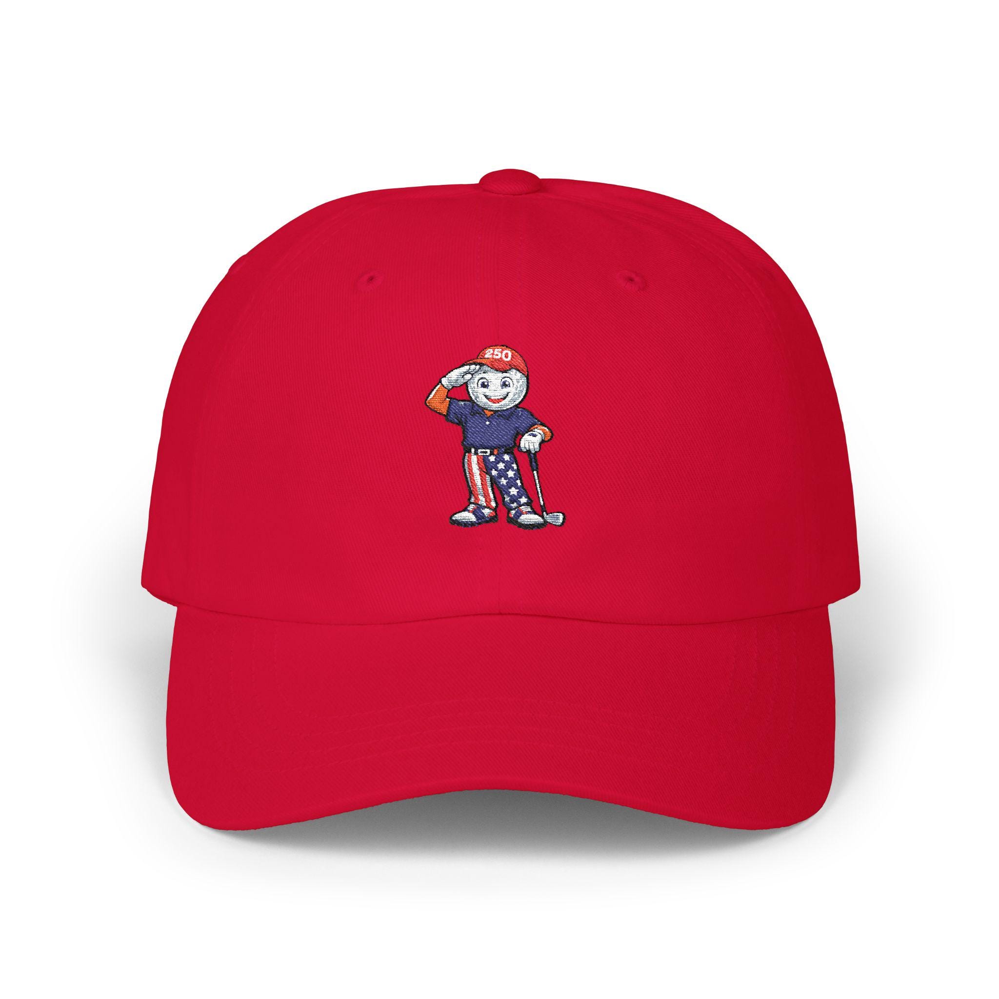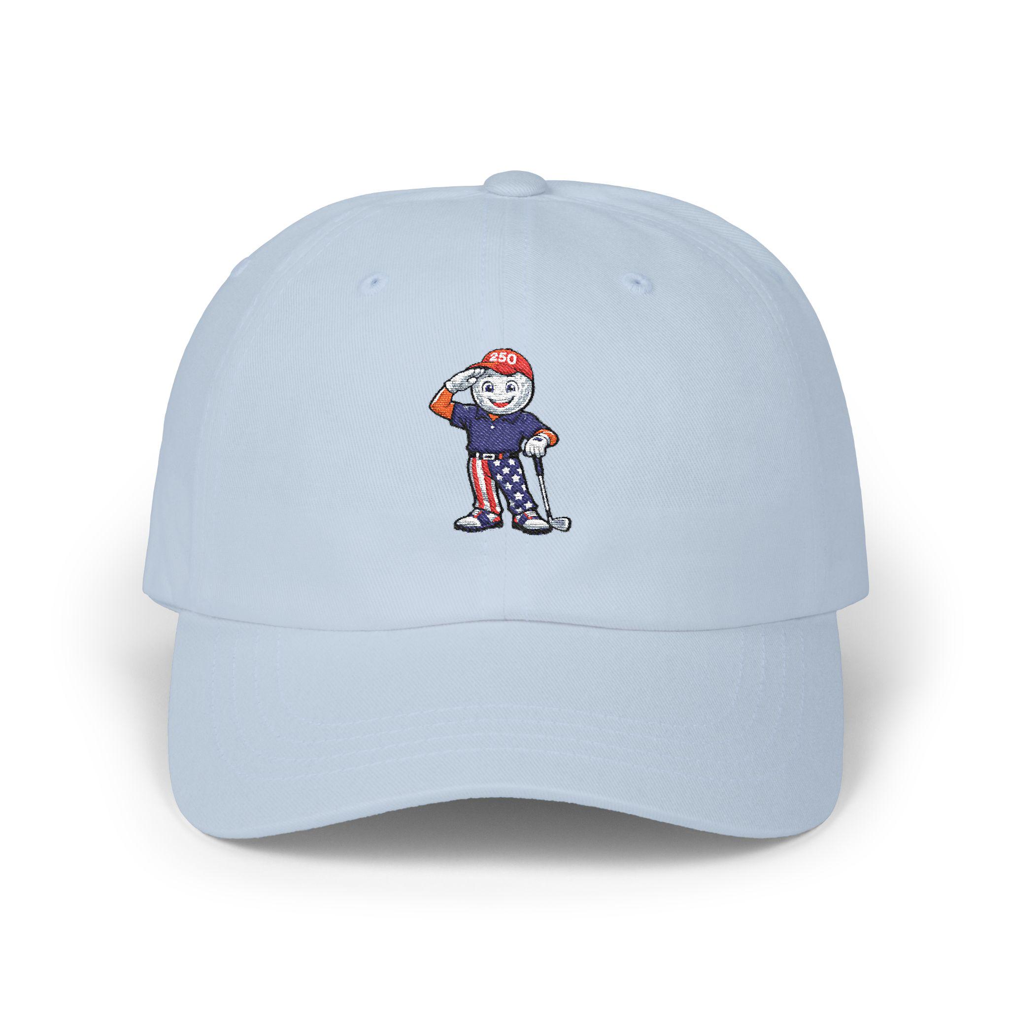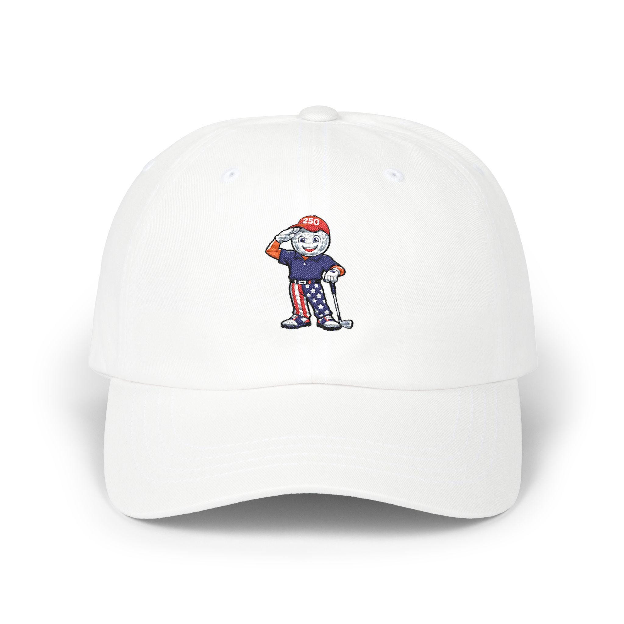 This limited-edition golf hat features a bold embroidered mascot: a golf ball-faced golfer decked out in red, white, and blue, saluting the fairway and freedom alike. With star-spangled pants, a “250” cap, and a driver in hand, he’s the ultimate tribute to laid-back patriotism and love of the game.