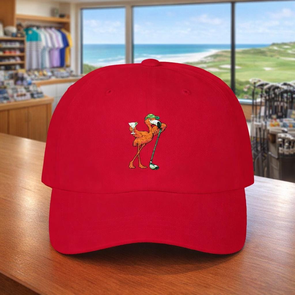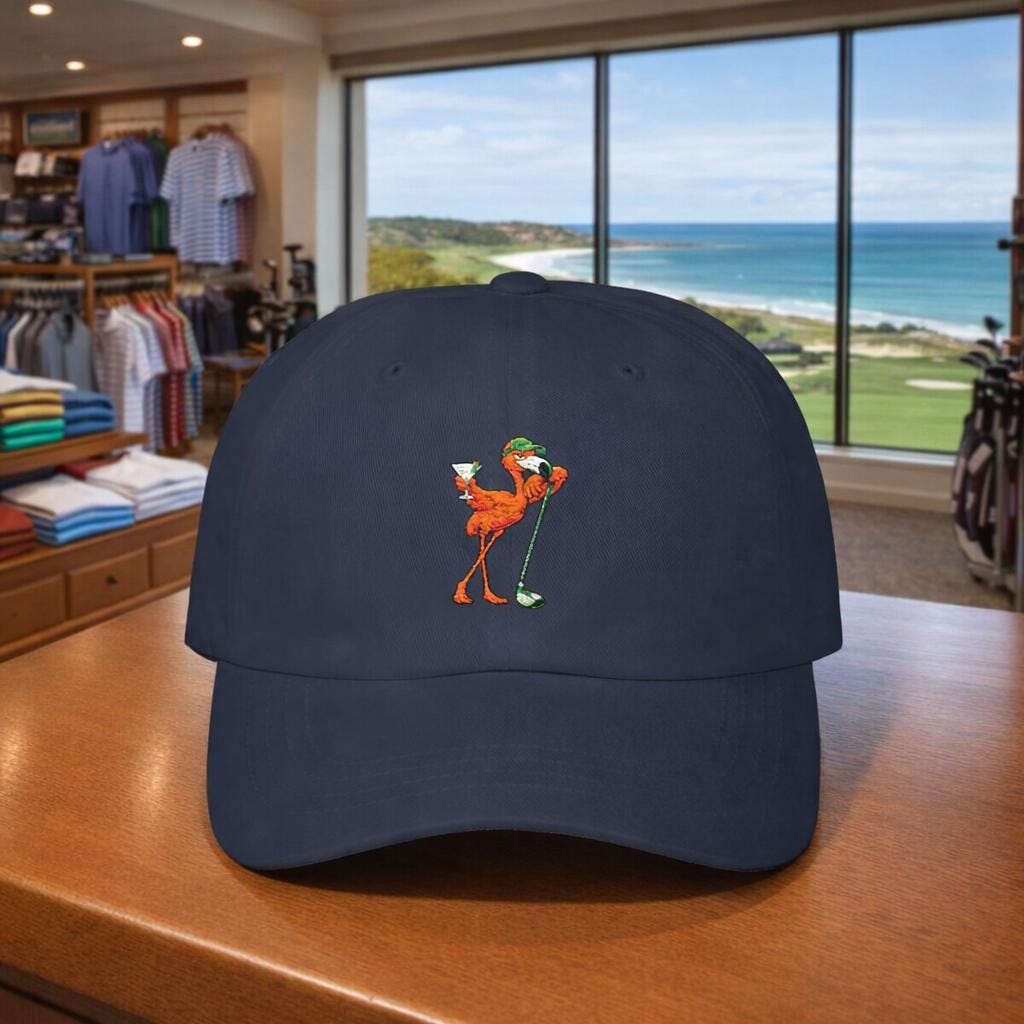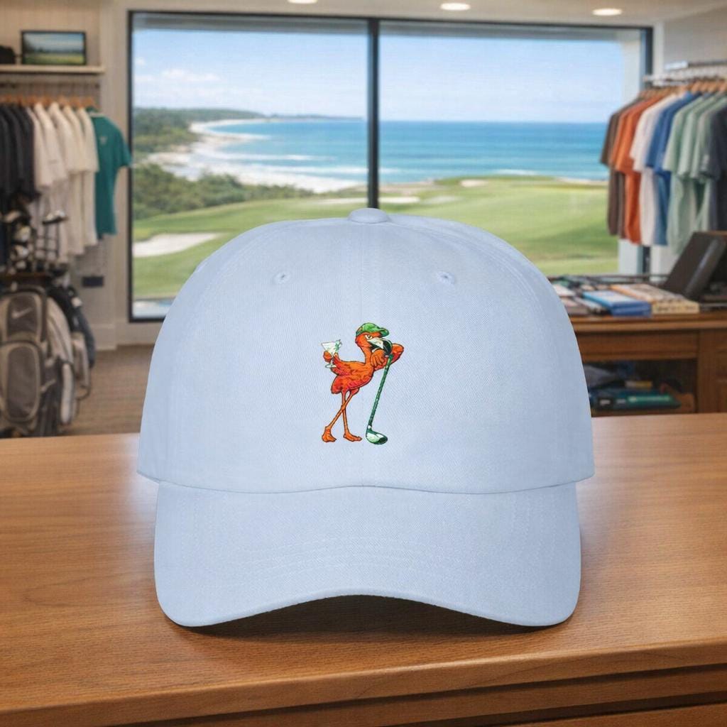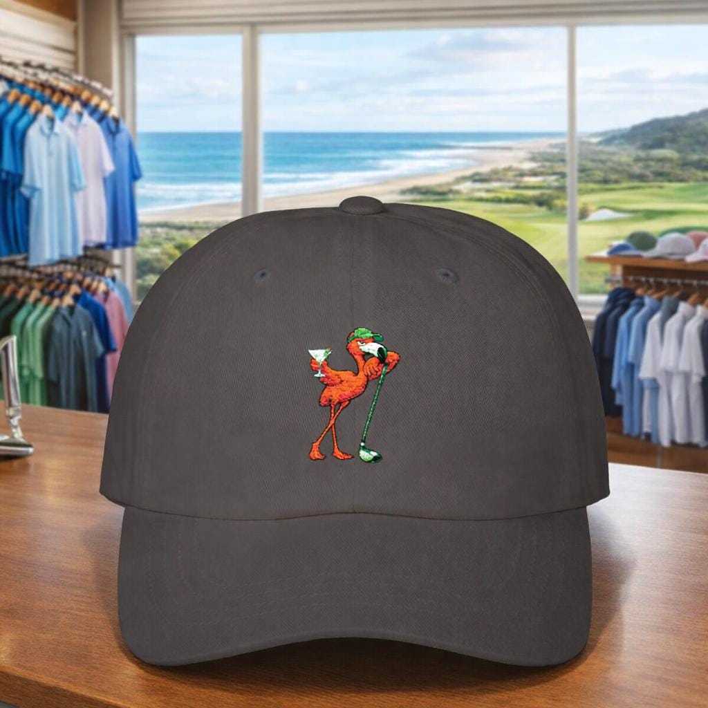 This classic golf dad cap brings a wink of laid-back clubhouse swagger to your rotation. A playful flamingo leans on a golf driver, martini in wing — a design that nods to post-round laughs, slow afternoons on the porch, and rounds that end with stories rather than scorecards. The low-profile, unstructured silhouette sits comfortably and casually, slipping on for a sunny tee time or an evening hang with friends. Subtle vintage touches like the antique brass buckle and precurved visor give it a familiar, worn-in charm that feels like something you’ve owned for years. Wear it tilted back with shades while you trade shots and tall tales, or pull it down for a quick walk to the 19th hole — it fits right into the rhythms of folks who golf for the company as much as the game.