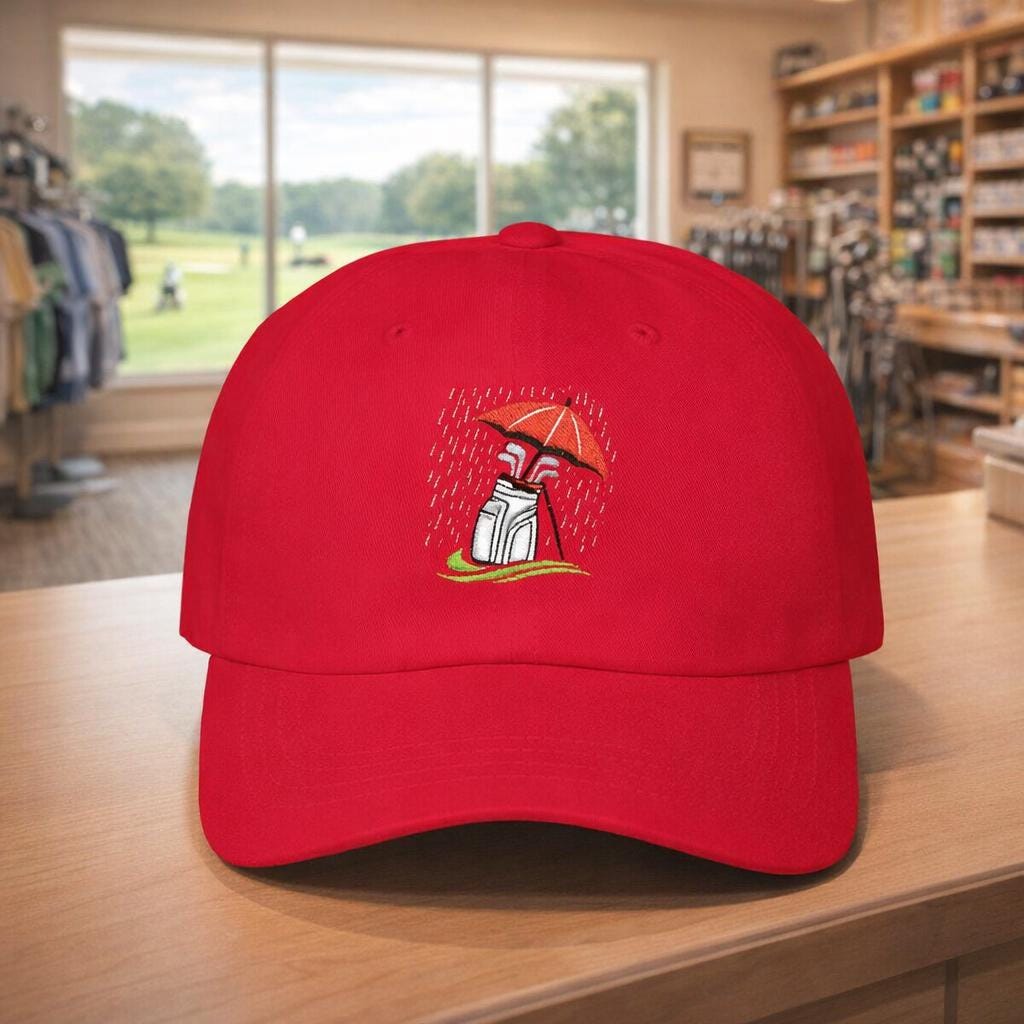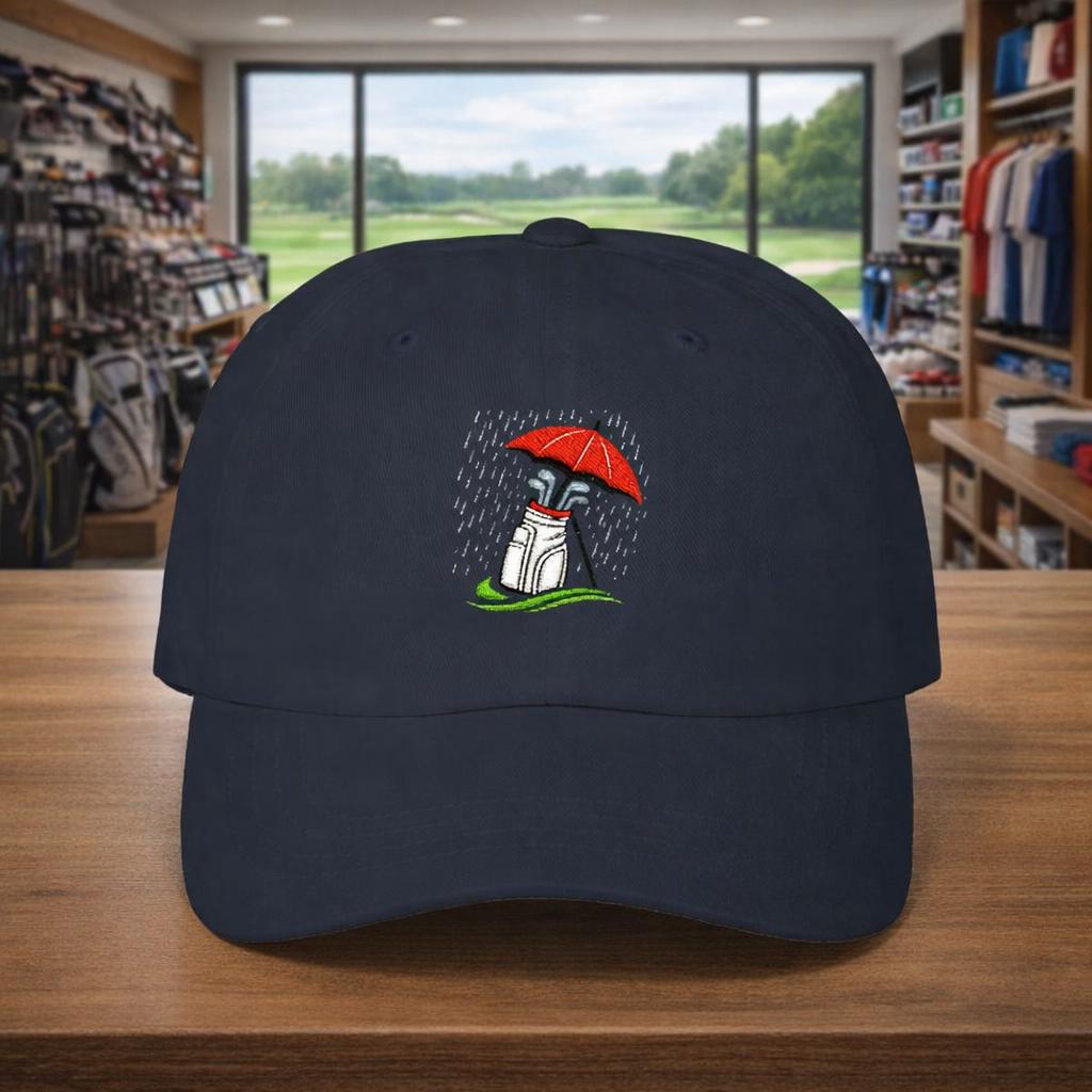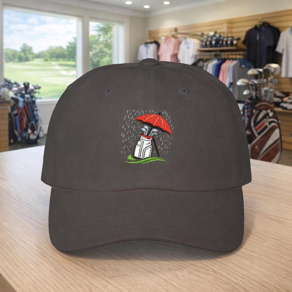 Mud-splashed fairways and steady drizzle — this cap nods to golfers who swap sunshine for soggy rounds without hesitation. Lightweight and low-profile, it sits close to the head so rain and wind don’t become distractions. The embroidered golf bag beneath an umbrella is a quiet salute to winter rounds in the Pacific Northwest: soggy tees, early tee times, and the calm focus that comes from playing through the weather. Wear it on the walk between holes, hung on the clubhouse peg after a round, or tossed in your golf bag for those days when the forecast calls for grit instead of glory. The muted palette and durable visor keep glare low and style understated, so the hat becomes part of your routine — not a statement piece, but a companion for long, wet games.