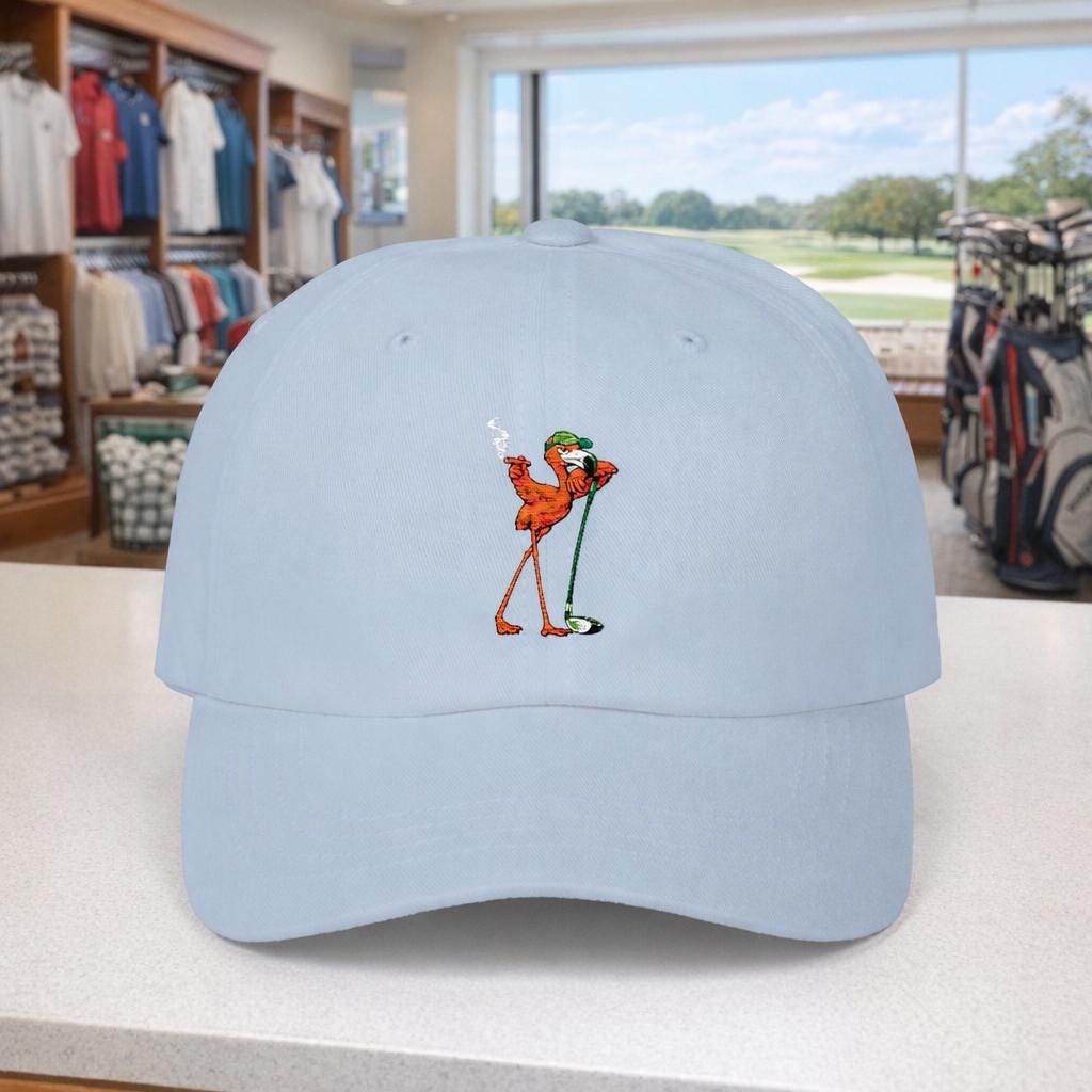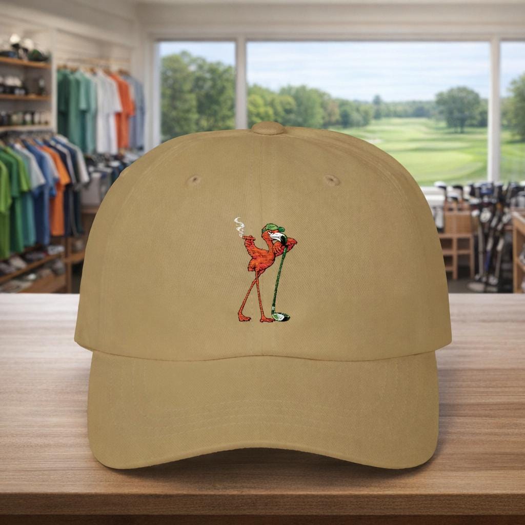 Flamingo Golfer Dad Cap, Flamingo Leaning on Driver Logo