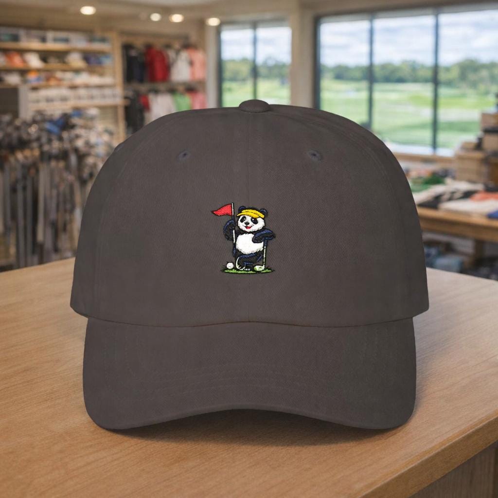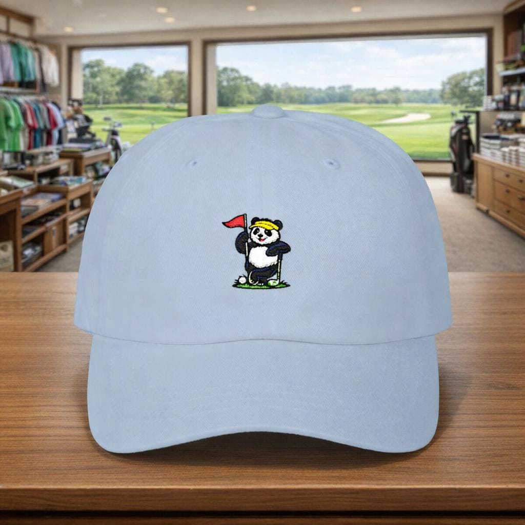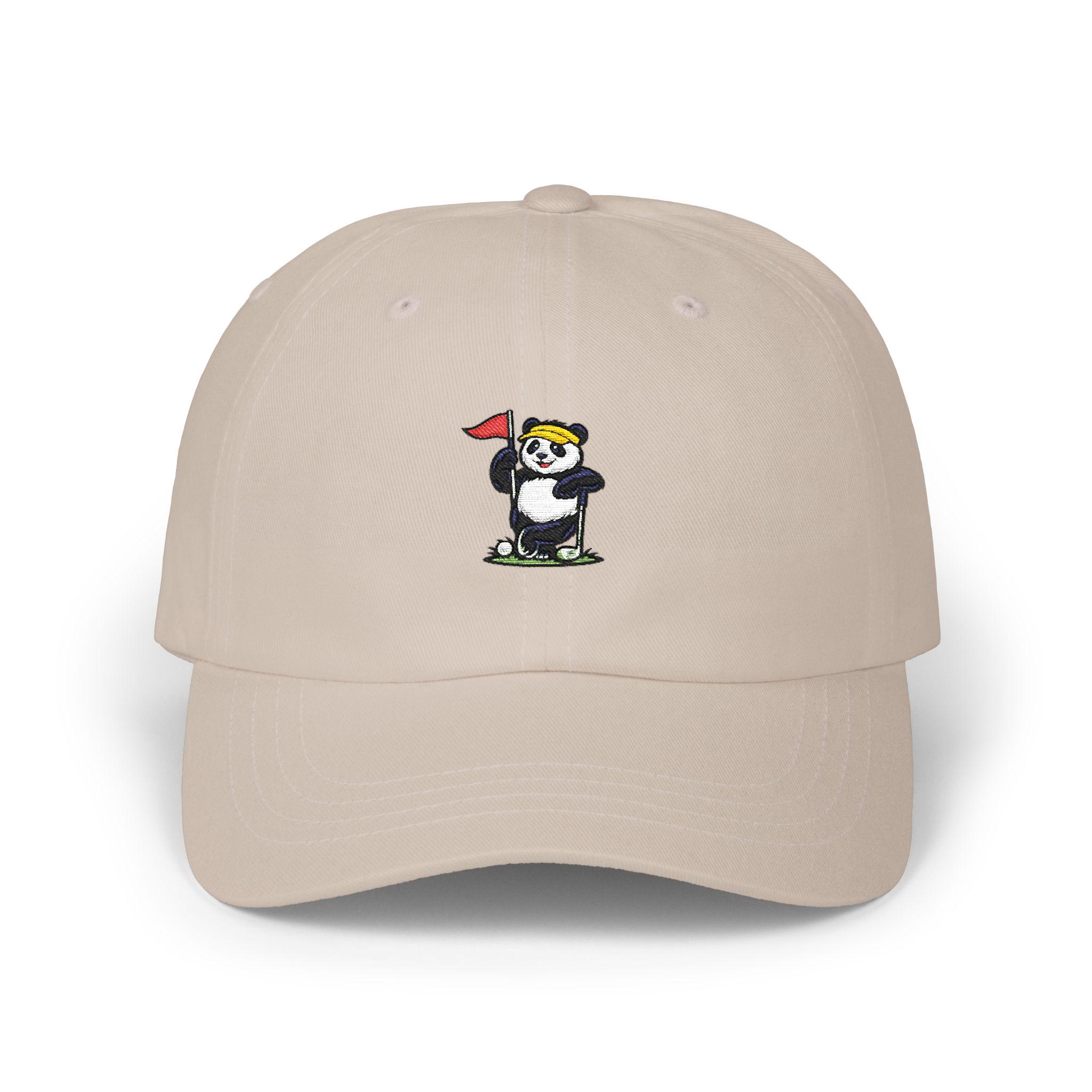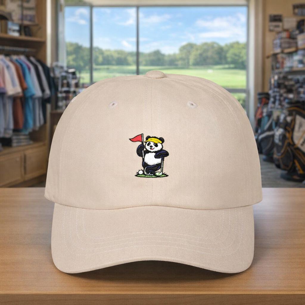A laid-back cotton dad cap embroidered with a playful panda golfer mid-celebration. The low-profile, unstructured crown and precurved Permacurv® visor give it a relaxed, worn-in look that slips into everyday life—on the course, at the driving range, or on weekend errands. The panda logo, clutching a flag and golf club, reads like a wink to anyone who knows the small triumph of a birdie: quiet pride and an easy smile. The adjustable hideaway strap with antique brass buckle lets you fine-tune the fit, while the sewn-in label and brand sticker on the visor add subtle authenticity. Lightweight and breathable in 100% cotton (with select color blends), this cap feels familiar from the first wear and keeps its character round after round.