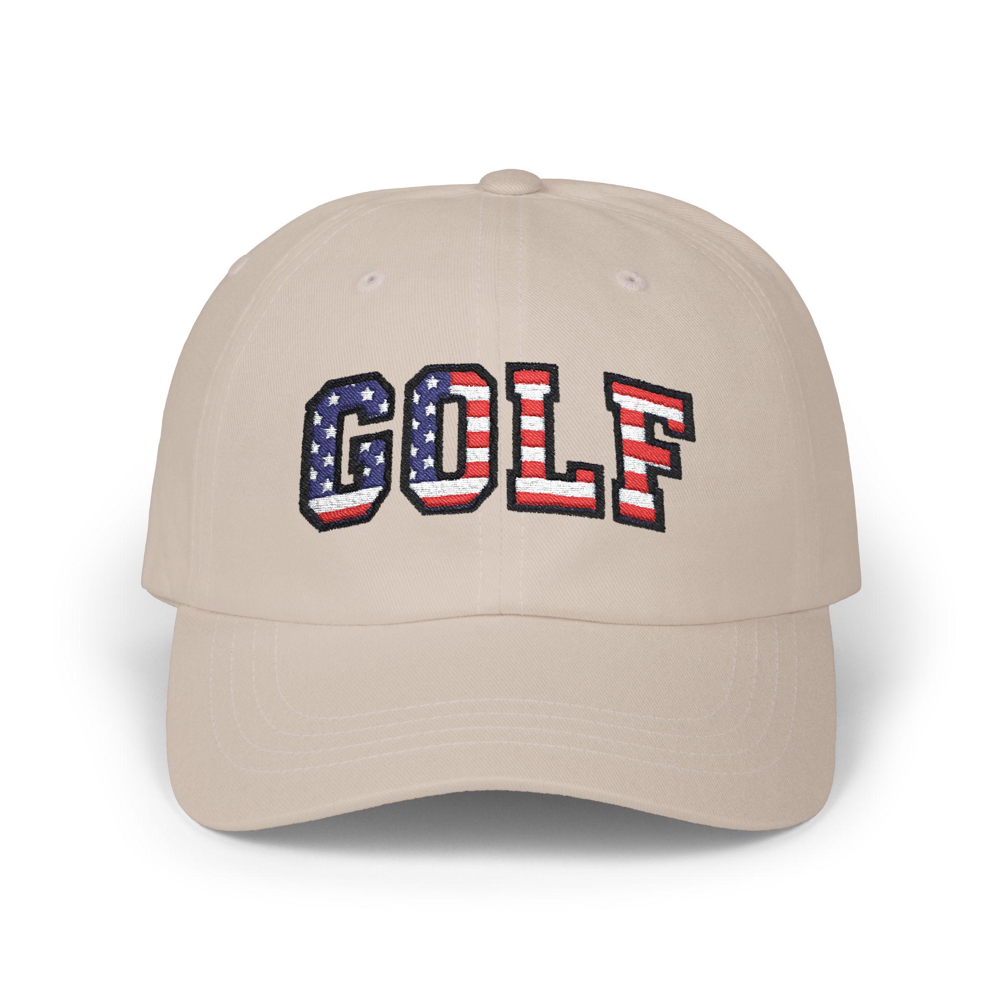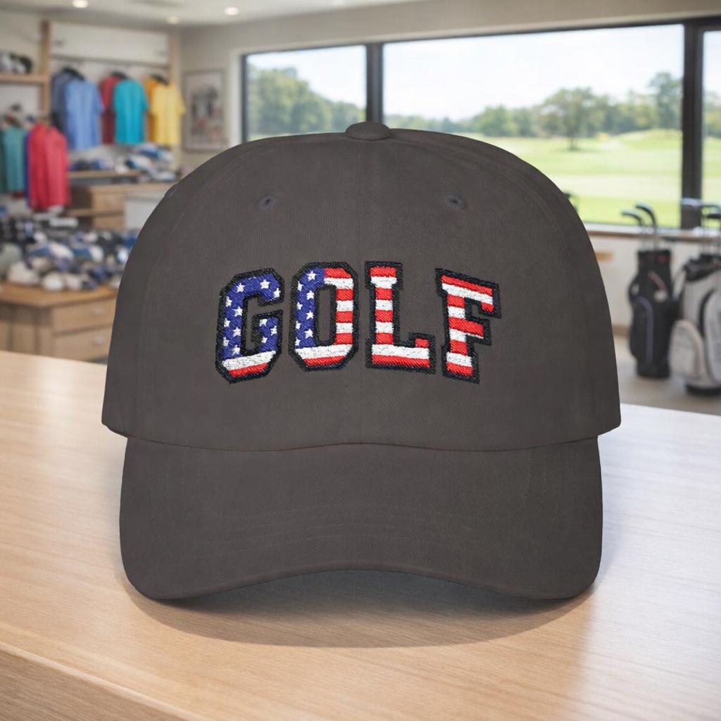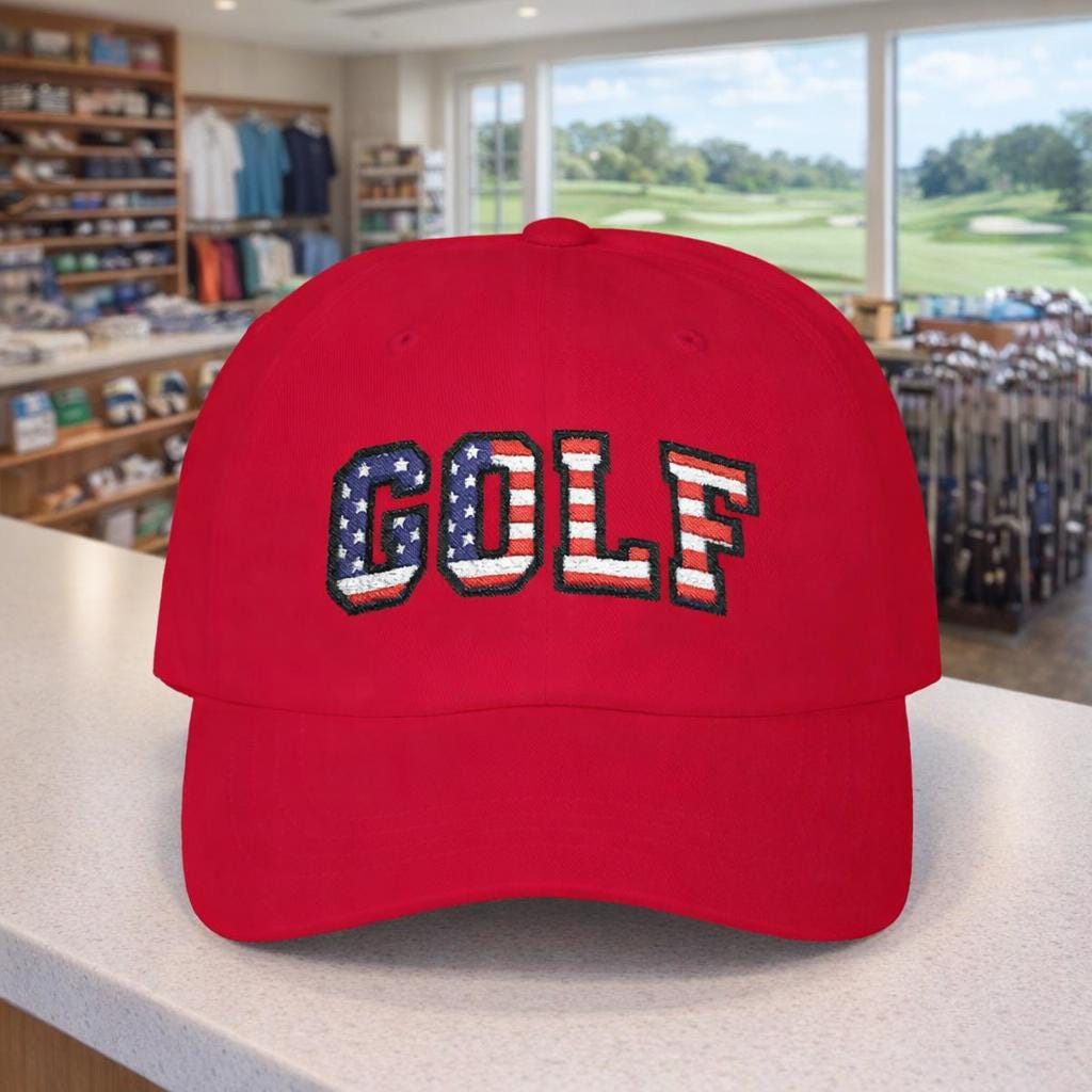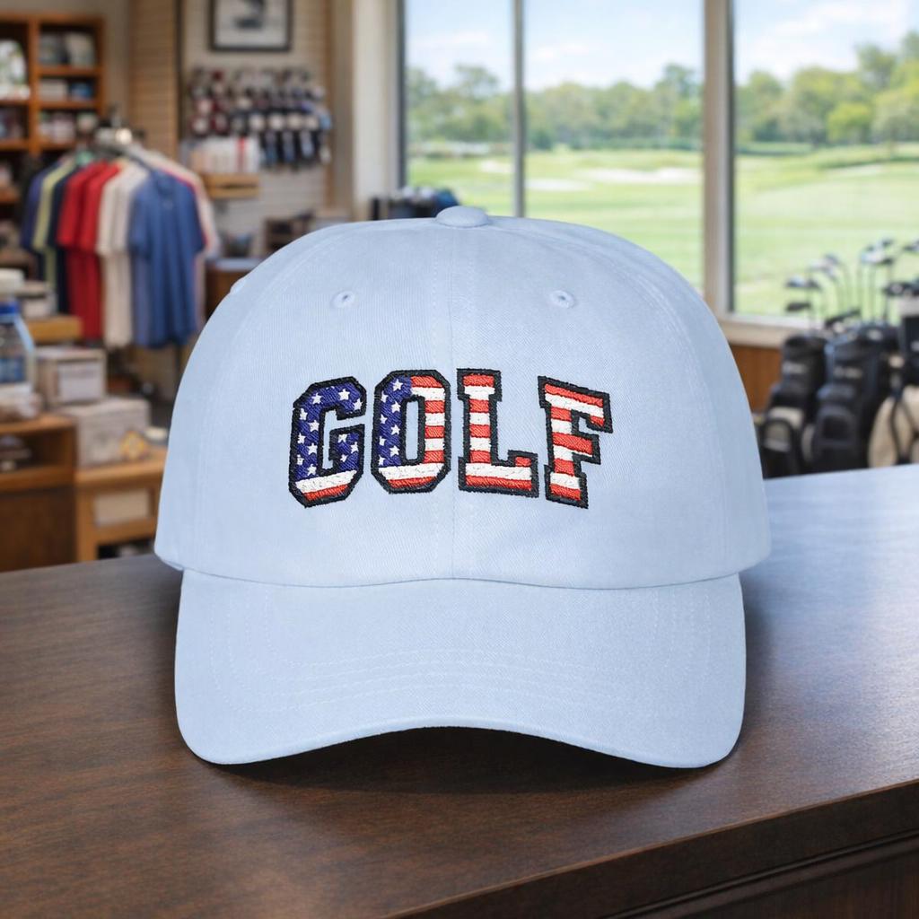 Carry a small, proud nod to July 4th, 2026 with this classic dad cap made for slow rounds and backyard barbecues. The GOLF lettering wears the colors of the American flag like a quiet celebration—subtle from afar, unmistakable up close. Lightweight cotton, a soft low-profile crown, and a precurved Permacurv® visor make it feel broken-in from the first wear. The hideaway strap with an antique brass buckle lets you dial in the fit, while the matched underbill keeps the look clean and intentional. Worn by weekend golfers and flag-waving neighborhood hosts alike, this cap settles into summer afternoons, early tee times, and holiday gatherings with easy, familiar comfort.