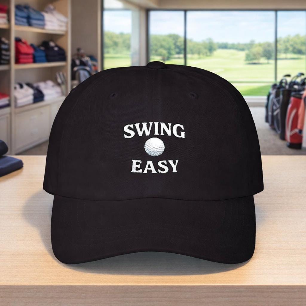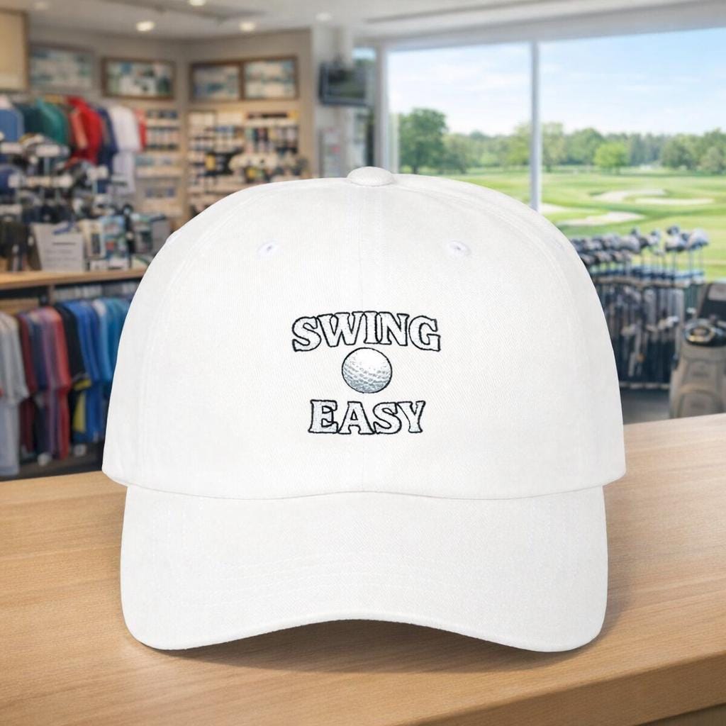 This classic golf dad cap carries a quiet message for golfers who value control over power. The simple golf logo nudges you to slow your swing and focus on rhythm — a small reminder that thoughtful technique often outplays brute force. Worn on crisp early mornings at the range or during a relaxed round with friends, the cap settles into the rhythm of practice: sun on the brim, steady breath, and a calm loop of swings. The low-profile silhouette and soft, unstructured crown make it feel lived-in from the first wear. Subtle details — the pre-curved visor, matching underbill, and antique-brass hardware — keep the look polished without shouting. It’s a hat that keeps you centered between shots, blending into clubhouse conversations and quiet, focused practice sessions alike.