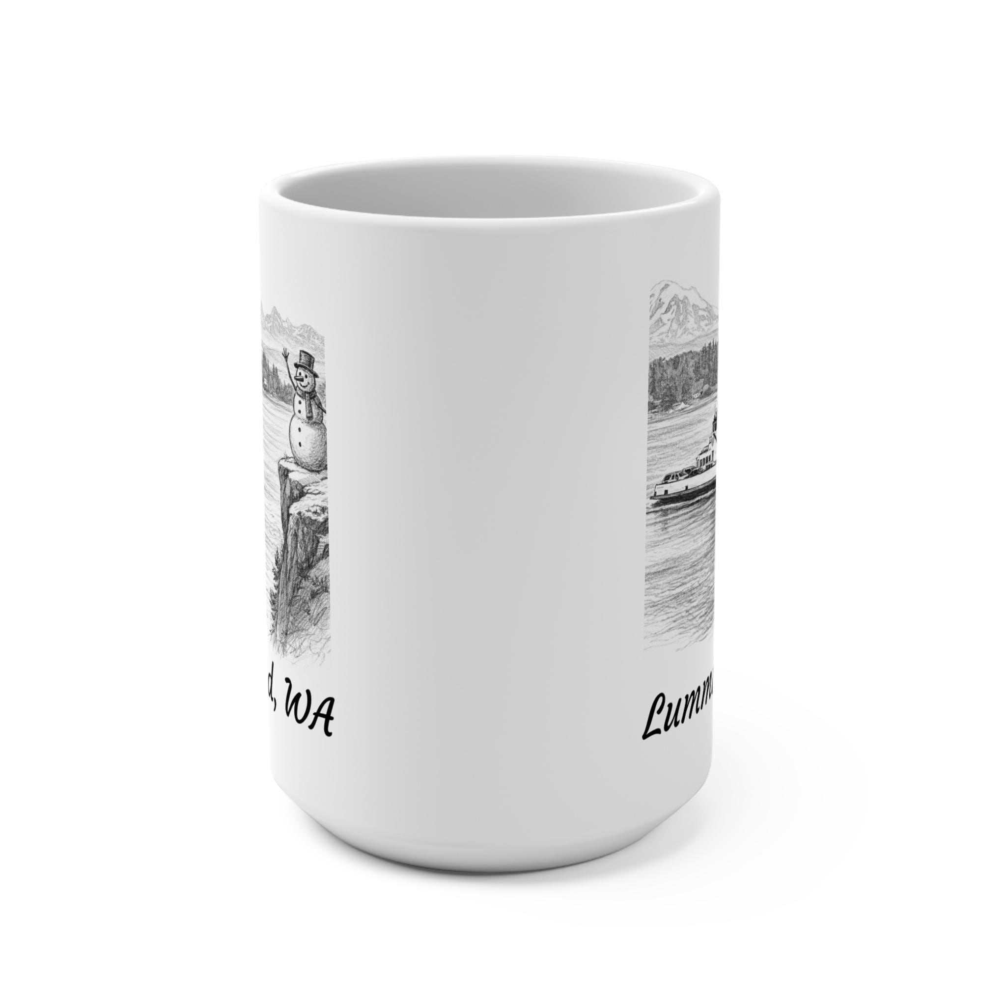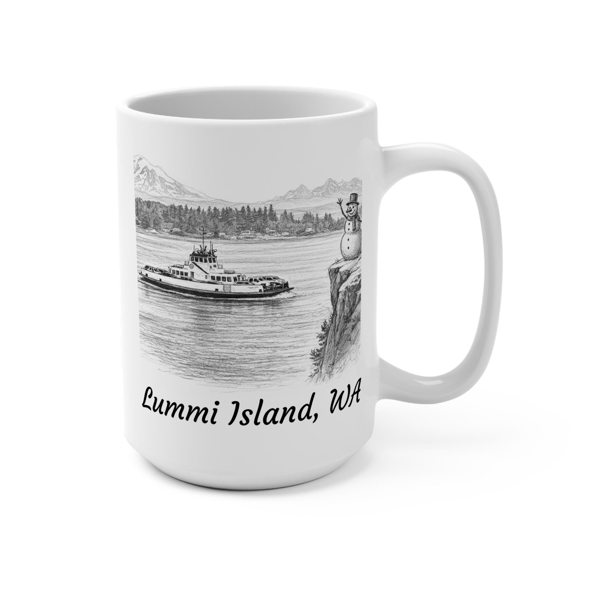 Steam curls from your hands as you cradle a wide, 15oz ceramic mug that carries a small winter scene from Lummi Island. A friendly snowman lifts a mittened wave while the ferry edges closer across gray-blue water. Sip slowly and let the image pull you into that quiet, briny cold—salt air, the low hum of the ferry, and the soft hush of newly fallen snow. This mug fits into mornings on the deck after an overnight storm, slow afternoons by the window, or cozy conversations after a walk on the beach. Built for everyday use, it brings a touch of island calm to daily coffee rituals and keeps that Lummi Island winter feeling within reach.