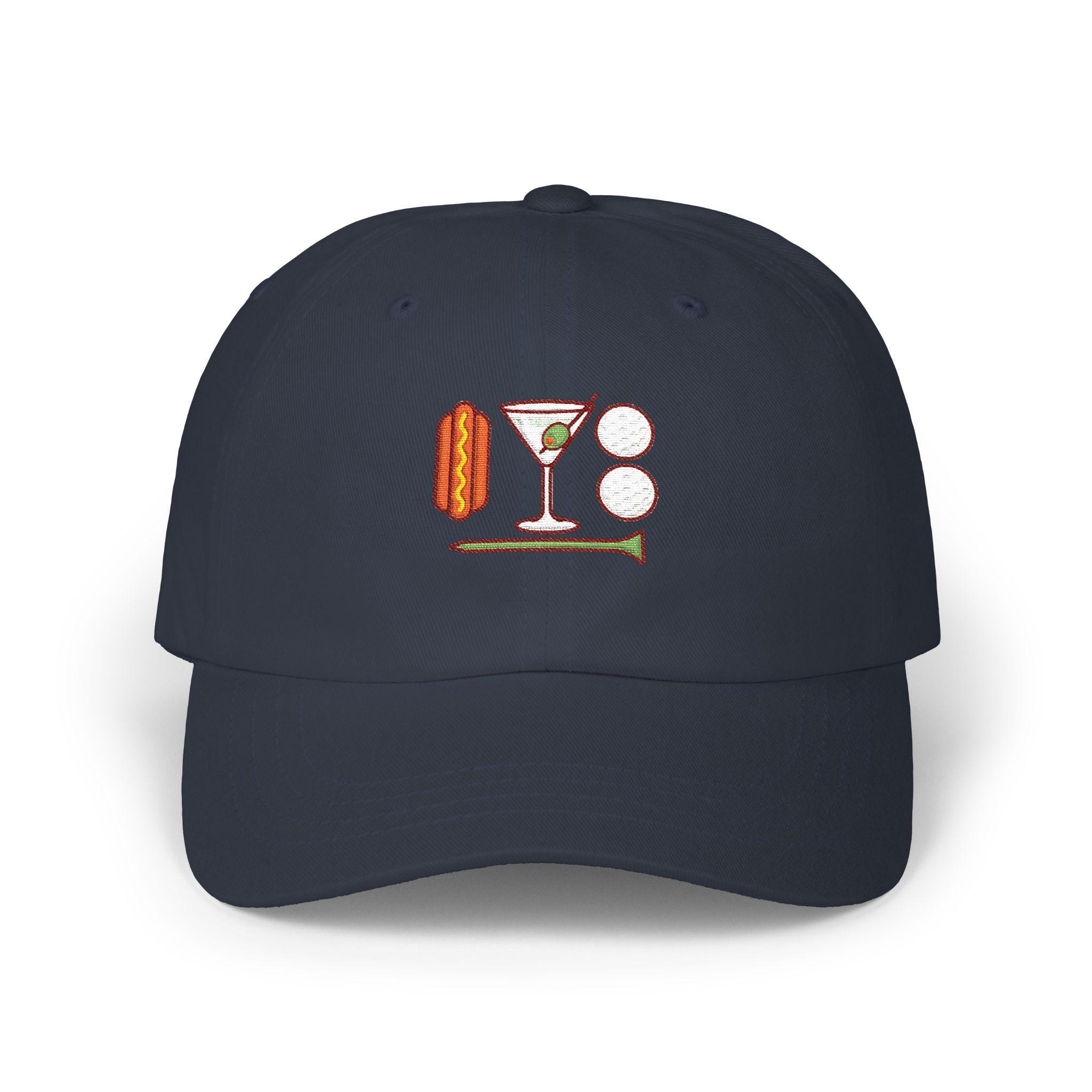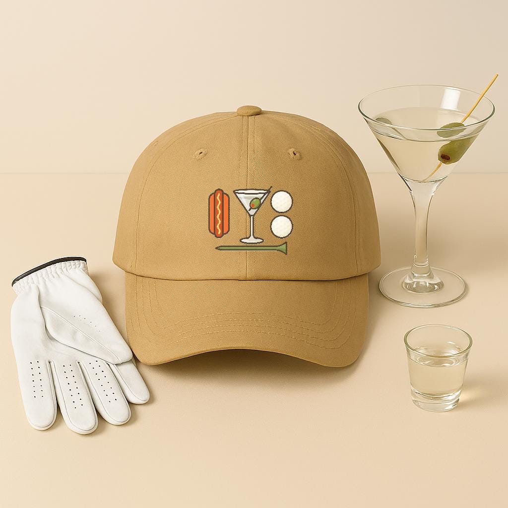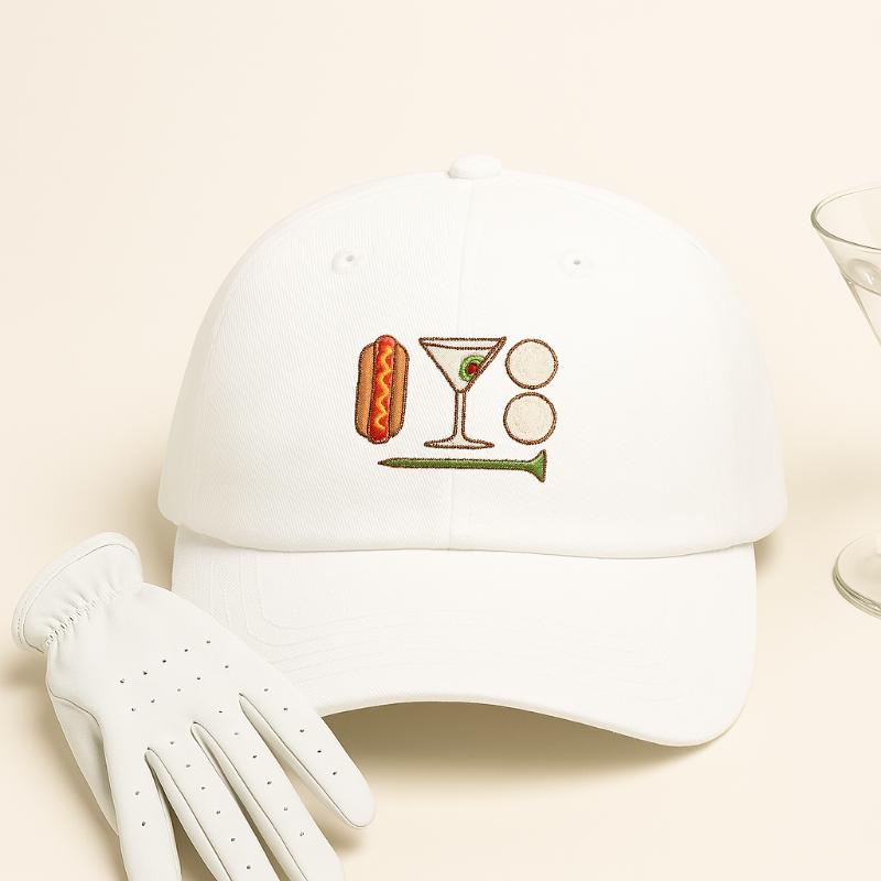 Slide this cap on and feel the easy rhythm of a weekend tee time. The worn-in silhouette leans casual — a low crown, soft panels, and a precurved visor that keeps sun out of your eyes without shouting for attention. Embroidered icons — a glizzie, martini, golf balls and tee — wink at the slow, social side of golf: long walks between holes, cold drinks in a cooler, friendly banter over a missed putt. It’s the kind of hat you reach for on Saturday mornings, when the course is quiet and the group chat is full of ‘you in?’ messages. Breathable cotton and an adjustable hideaway strap mean it moves with you, from the first drive to the 19th-hole hangout. Subtle branding and a muted underbill keep the look grounded, while the graphics invite a knowing nod from fellow weekend golfers.