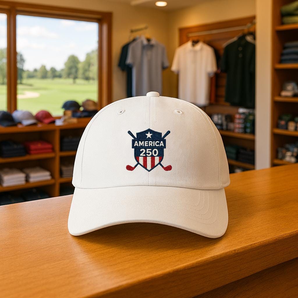 This classic golf dad cap carries a quietly patriotic edge — an American shield emblem crossed by vintage golf clubs, commemorating 250 years of the nation. The low-profile, unstructured crown sits easy on the head. The precurved Permacurv® visor and matching underbill give it a lived-in look straight away. Wear it on a sunny morning at the course, while walking the neighborhood green, or at a relaxed backyard barbecue celebrating the country’s milestone. It reads like a nod to tradition and the slow rhythm of a round of golf — familiar, steady, and understatedly proud.