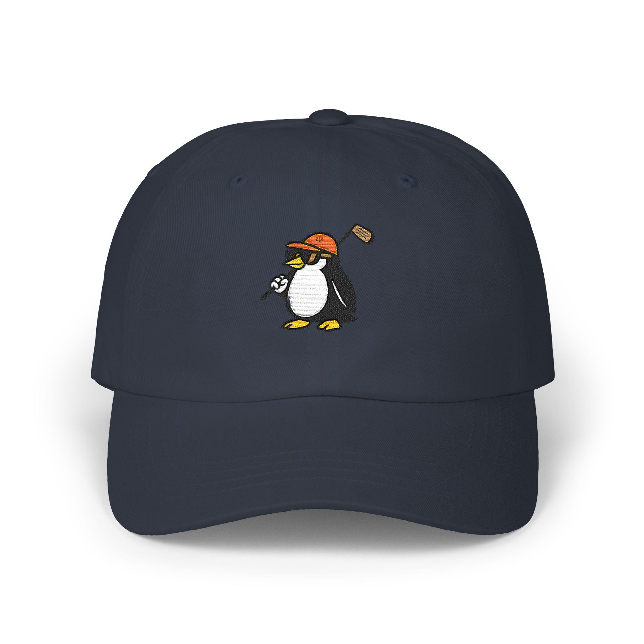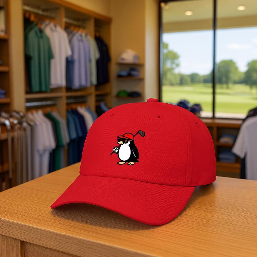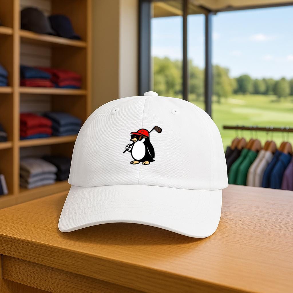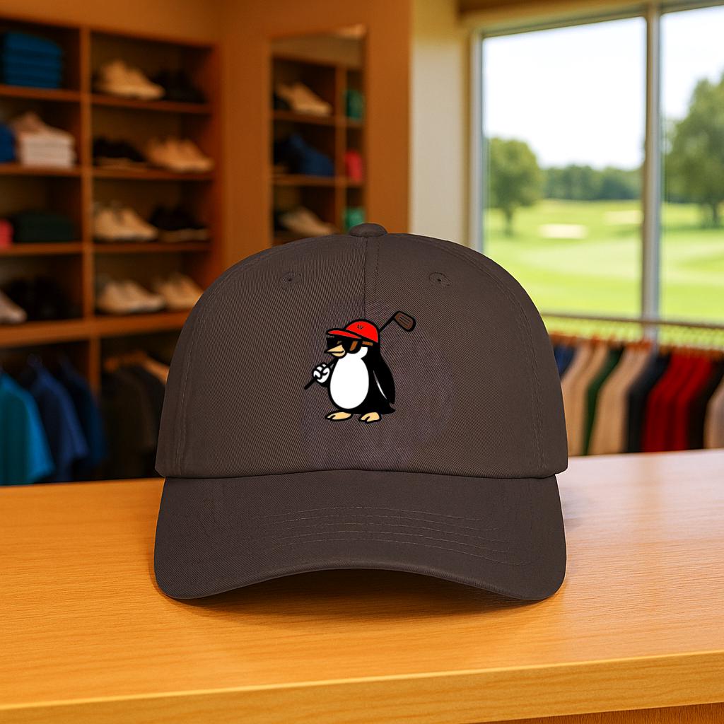 Light, playful, and a little cheeky — this dad cap brings a wink to the fairway. A cartoon penguin in shades and a tilted golf cap slings his club over his shoulder like he’s just finished a brilliant (or brilliantly lucky) round. Wear it on the drive to the course, clipping into the cart, or during a laid-back post-game drink. The low-profile silhouette and soft, unstructured crown keep the look relaxed, while the antique-brass hideaway strap lets you dial in a comfortable fit. It’s for golfers who keep score but don’t take themselves too seriously — the hat that signals you came to enjoy the game, the company, and maybe a little mischief under the sun.