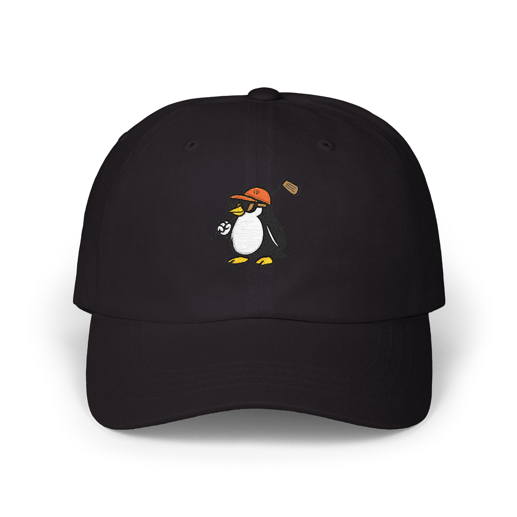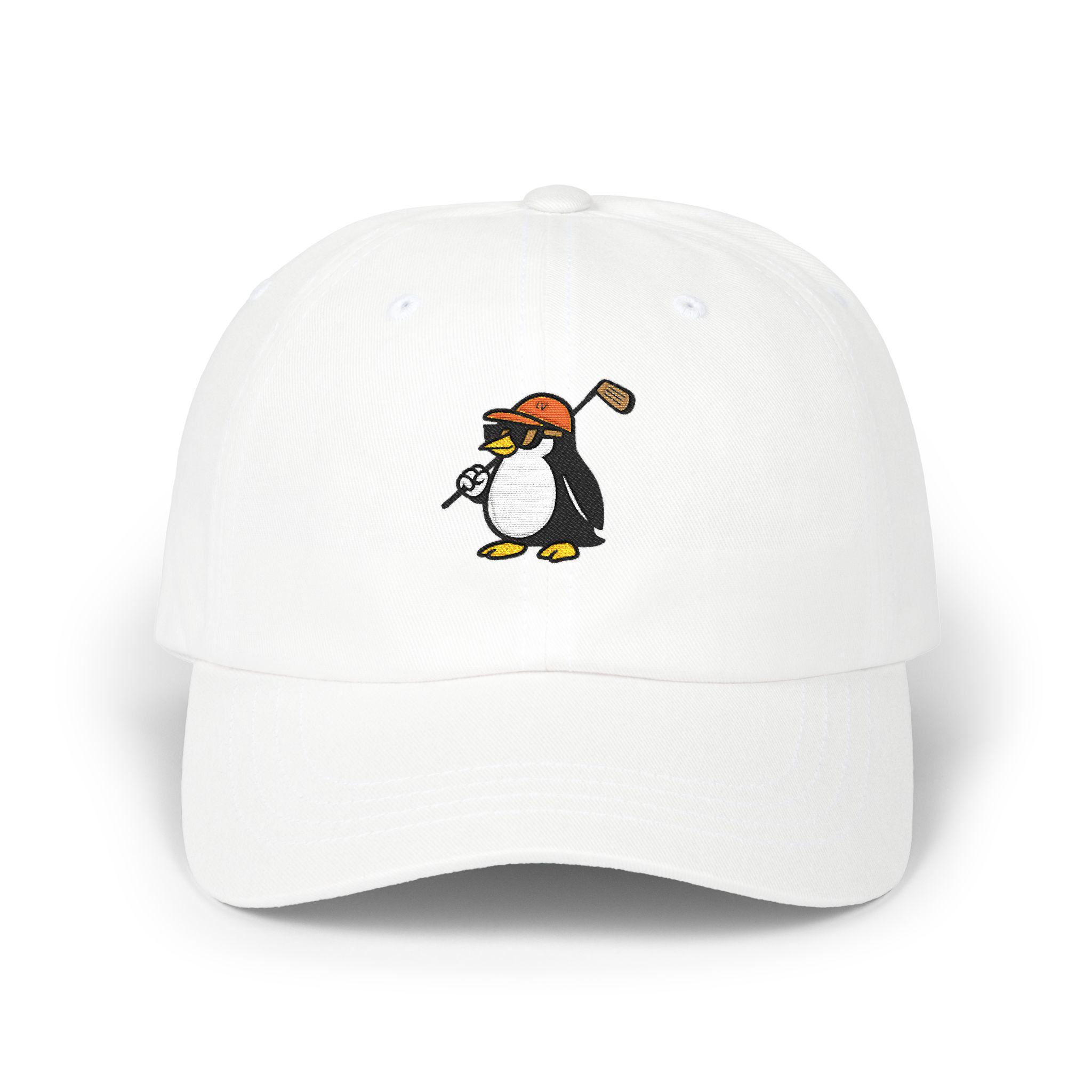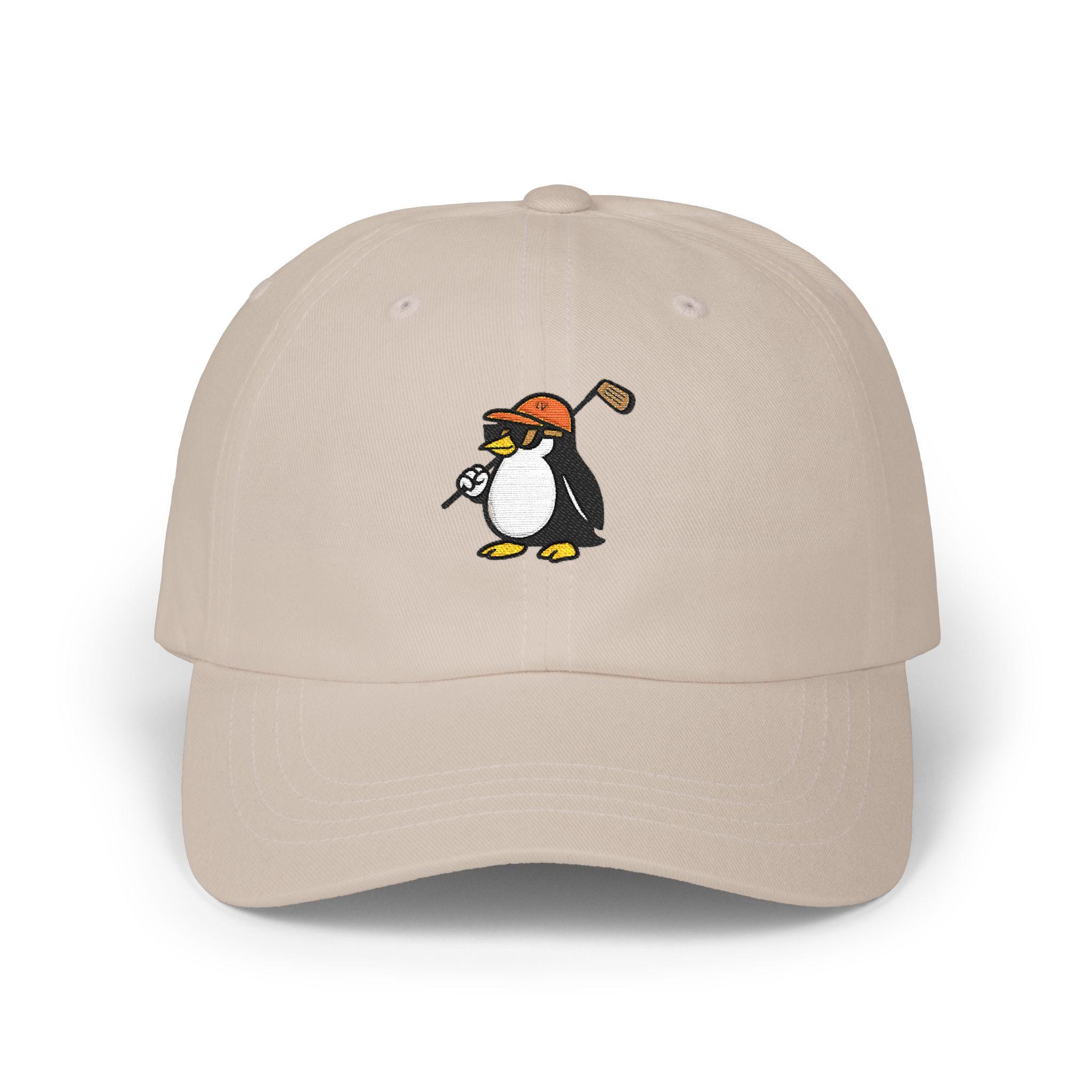 Light, playful, and a little cheeky — this dad cap brings a wink to the fairway. A cartoon penguin in shades and a tilted golf cap slings his club over his shoulder like he’s just finished a brilliant (or brilliantly lucky) round. Wear it on the drive to the course, clipping into the cart, or during a laid-back post-game drink. The low-profile silhouette and soft, unstructured crown keep the look relaxed, while the antique-brass hideaway strap lets you dial in a comfortable fit. It’s for golfers who keep score but don’t take themselves too seriously — the hat that signals you came to enjoy the game, the company, and maybe a little mischief under the sun.