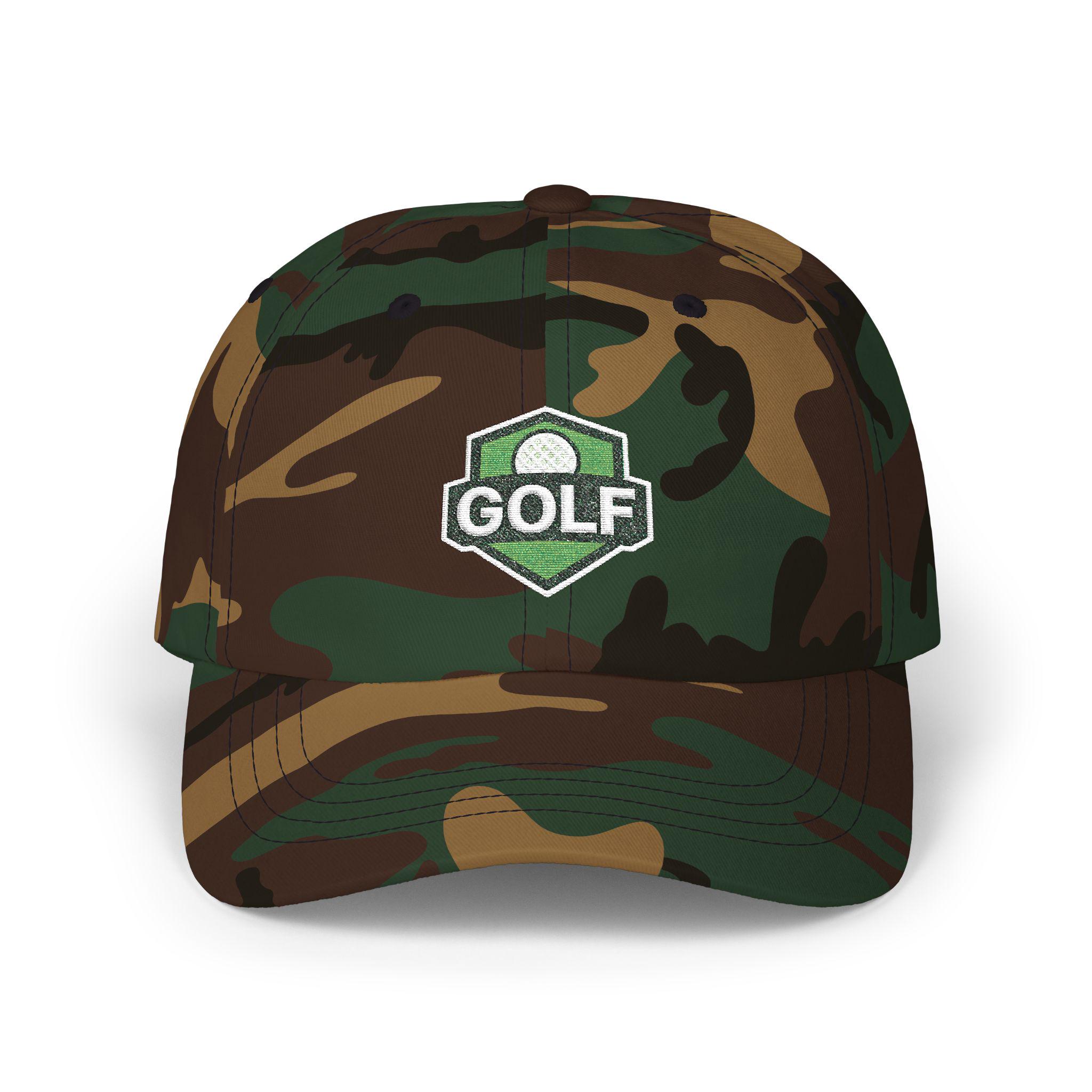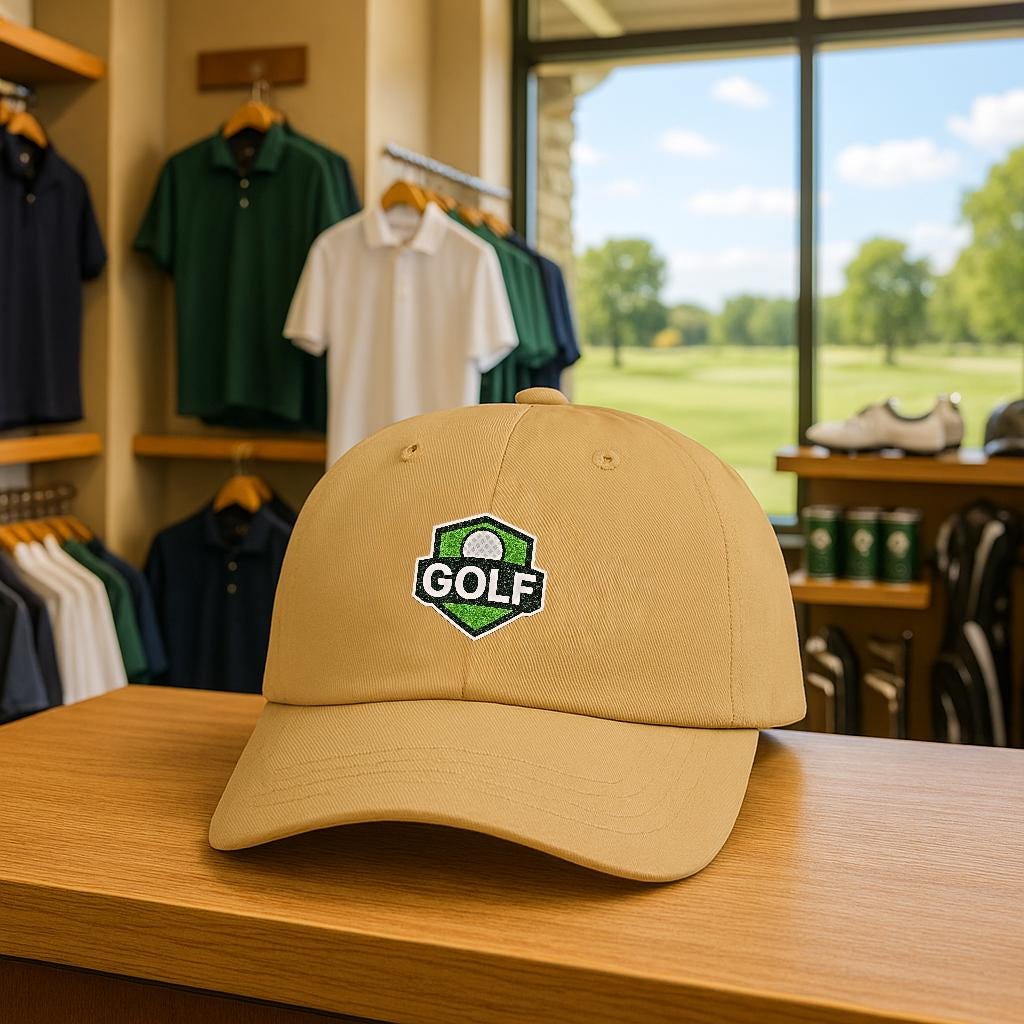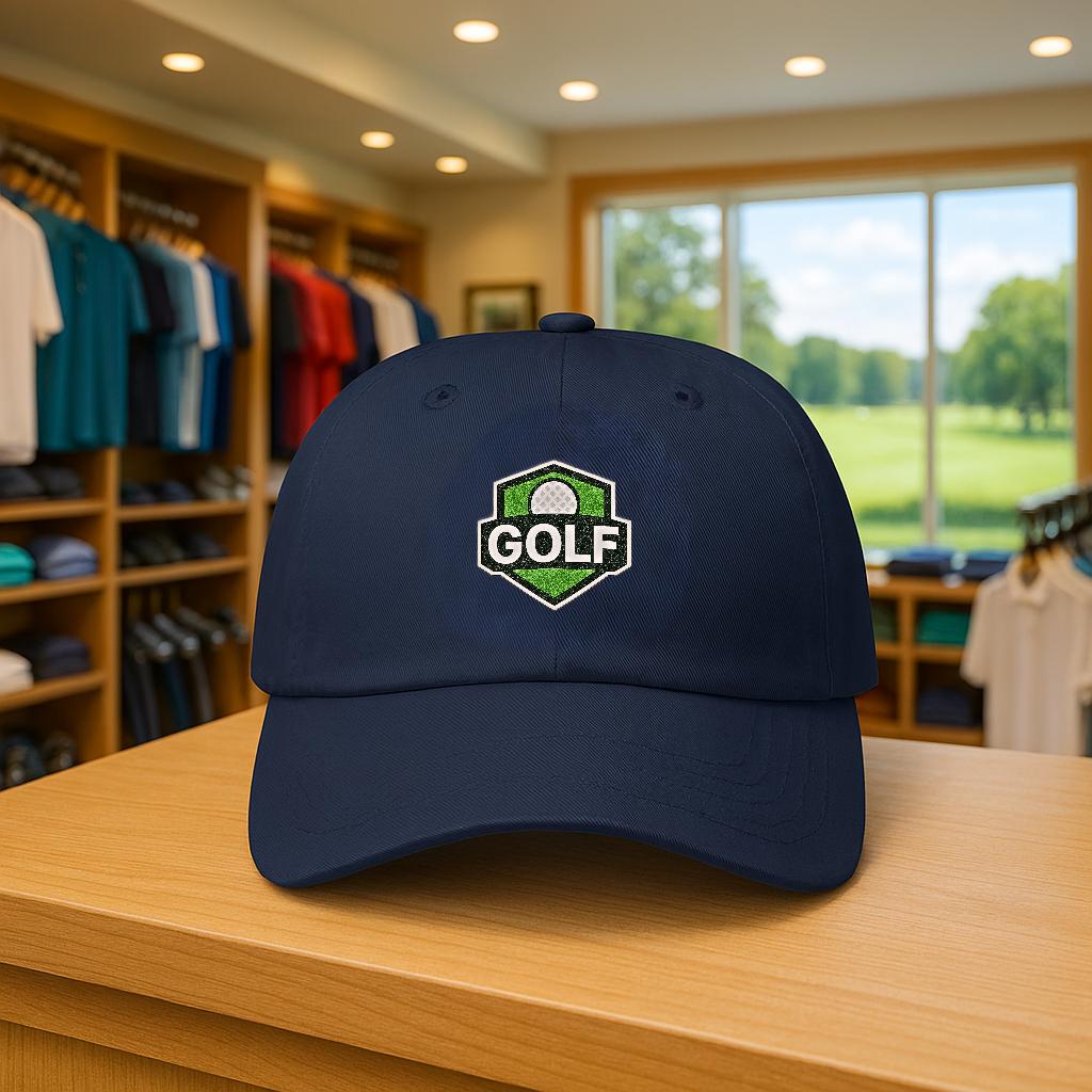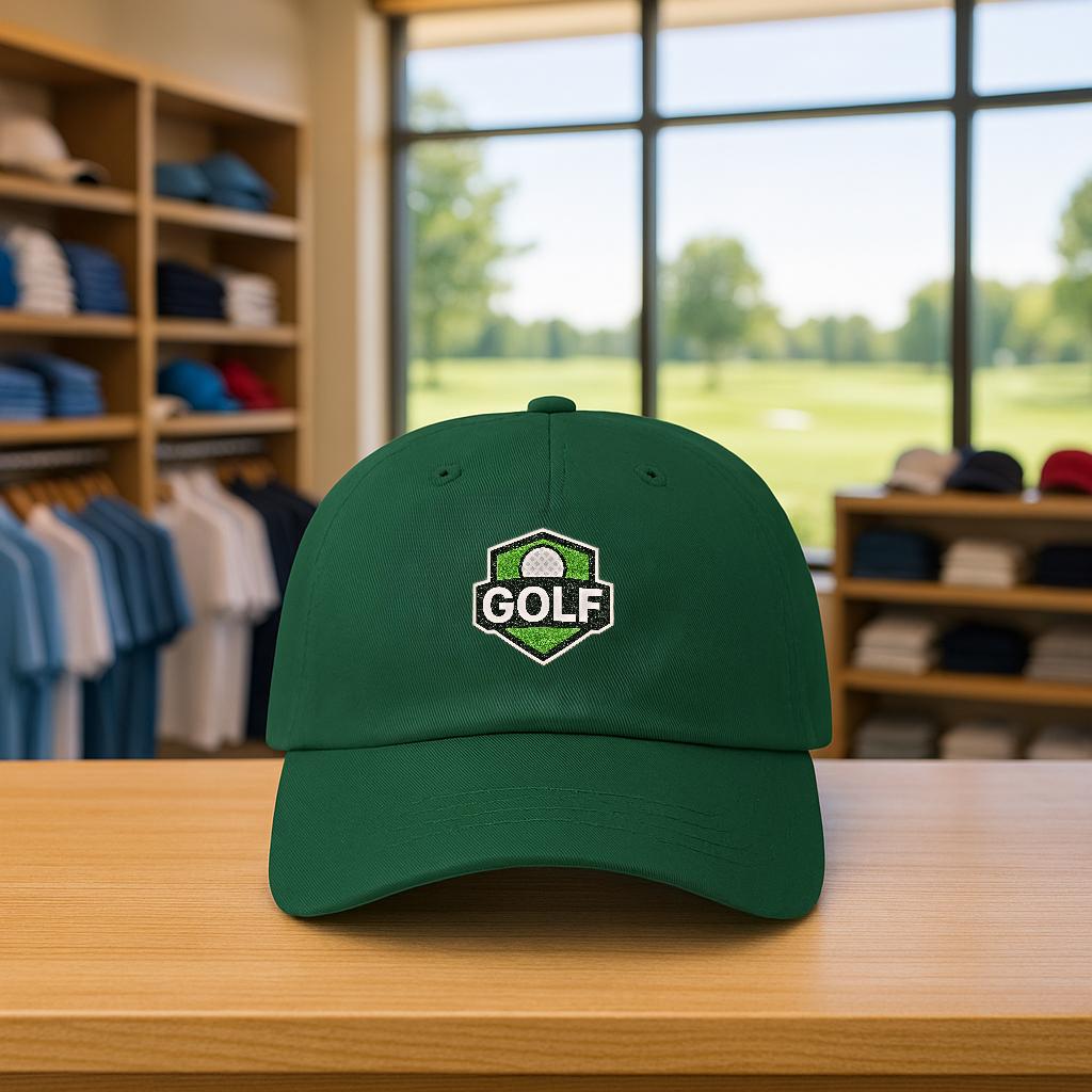 A low-profile, unstructured dad cap embroidered with a refined golf shield logo — made to be worn from the first tee to the clubhouse bar. Soft 100% cotton (with a Green Camo option in a cotton/poly blend) and a precurved Permacurv® visor give it a broken-in feel from day one. The six-panel build with stitched eyelets keeps breathability steady through warm rounds, while the hideaway self-fabric strap and antique brass buckle let you dial in a snug, personalized fit. Small details like the matched underbill, brand sticker on the visor, and sewn-in label give it a quietly polished look. This cap sits low and relaxed, the kind you reach for when you want a bit of sun protection and a lot of slow-course confidence.