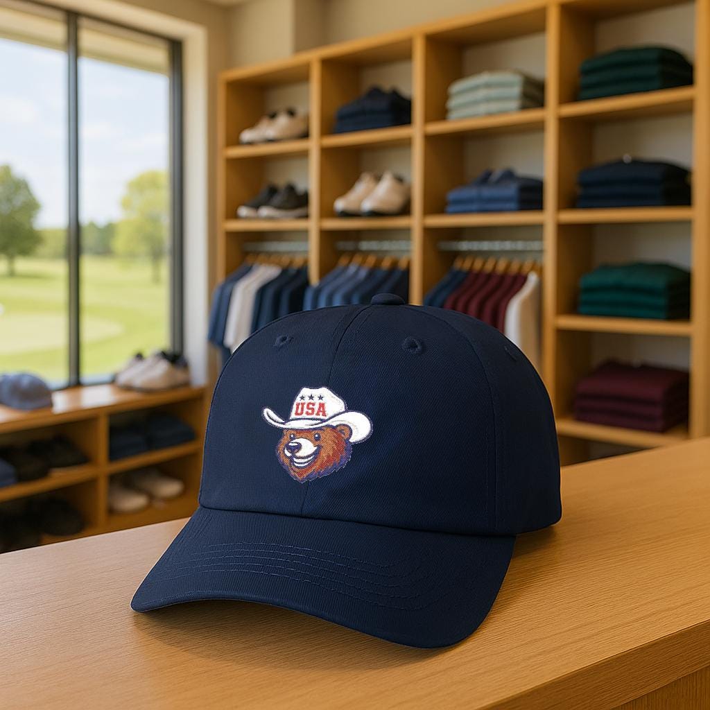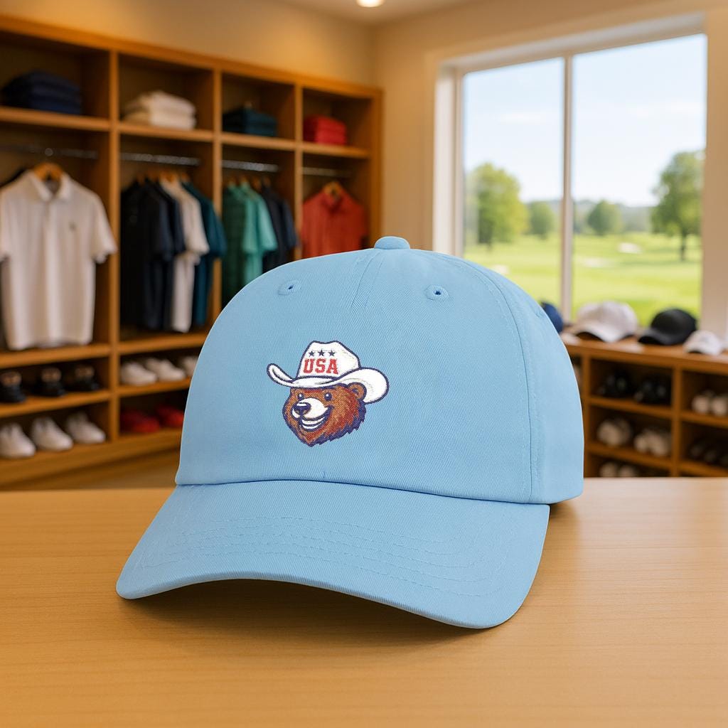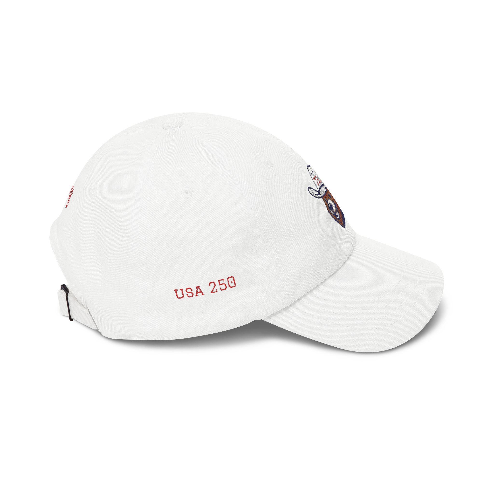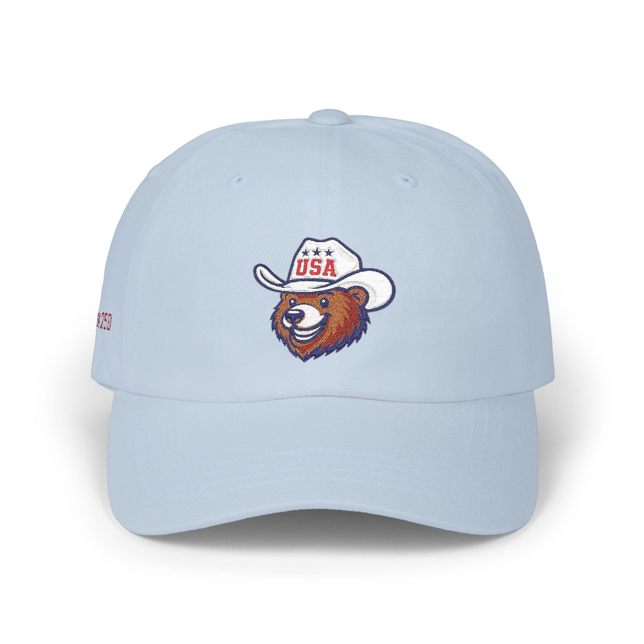 This dad cap brings a warm, Americana mood to everyday wear. Picture a laid-back afternoon at a small-town parade: a friendly bear tipping a patriotic cowboy hat, the bold "USA 250" mark stitched like a badge of shared pride. The low-profile silhouette and precurved visor sit effortlessly on the head, slipping into summers of barbecues, county fairs, and long drives with windows down. It feels familiar and easy — the kind of cap you reach for when you want something casual that still speaks to heritage and hometown spirit. Worn by adults who love rustic charm and subtle patriotism, it pairs naturally with flannel shirts, faded denim, and storytelling evenings beneath string lights.