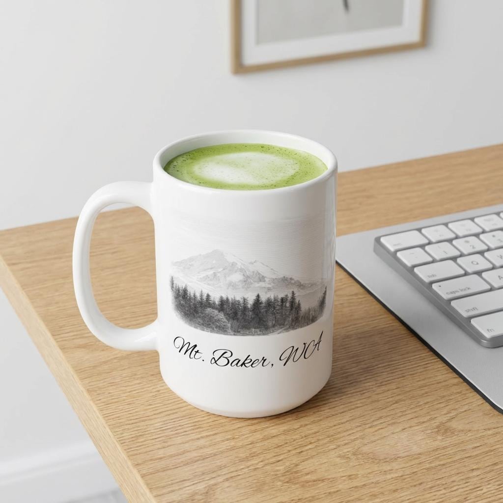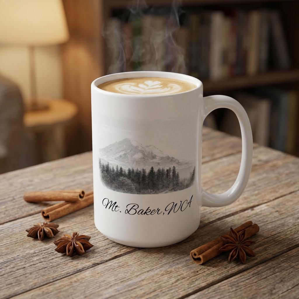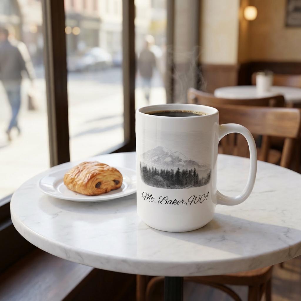 Wake up to the silent slope of Mt. Baker each morning. This 15oz ceramic mug carries a delicate sketch of the mountain — clean lines, airy negative space, and the gentle heft of a well-made cup. It feels steady in your hands, the C-handle offering a familiar, comfortable grip as you sip slow coffee or tea and watch light shift across the room. For those who collect small reminders of the Pacific Northwest, or anyone who remembers alpine mornings and crisp mountain air, this mug turns an ordinary pause into a quiet, scenic moment. It sits on the counter beside maps, photos, and dog-eared trail notes, blending into routines that value place, memory, and clarity.